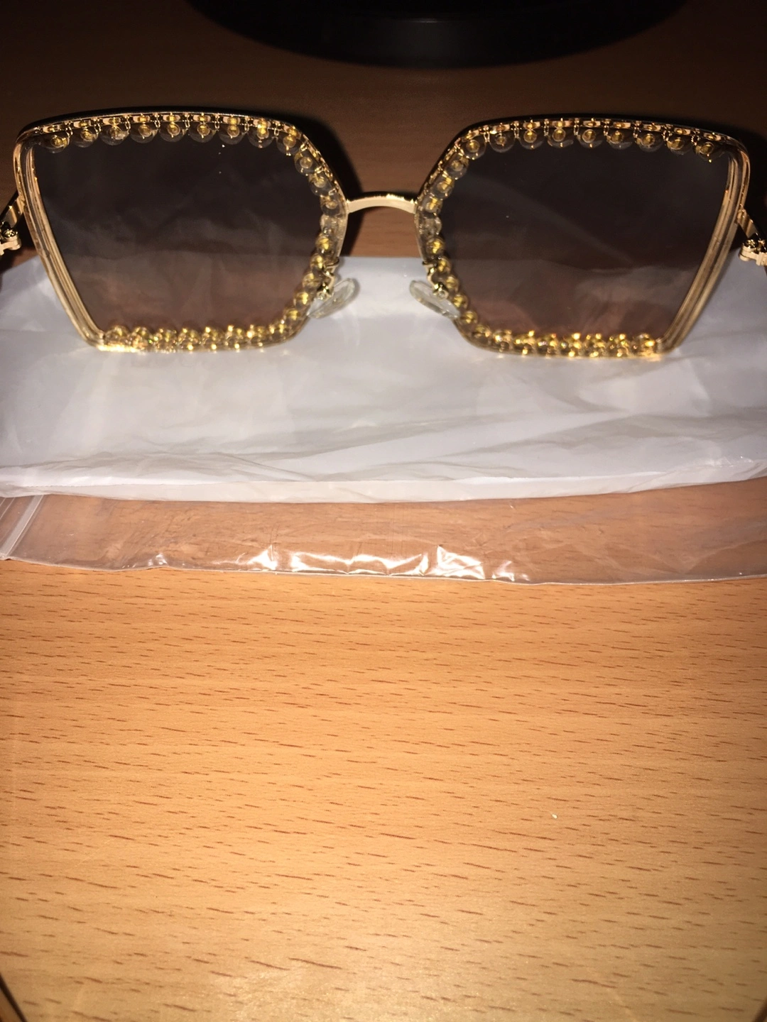 These Gucci sunglasses feature a gold-toned frame embellished with crystals. The gradient lenses offer UV protection. They're a stylish accessory for sunny days!