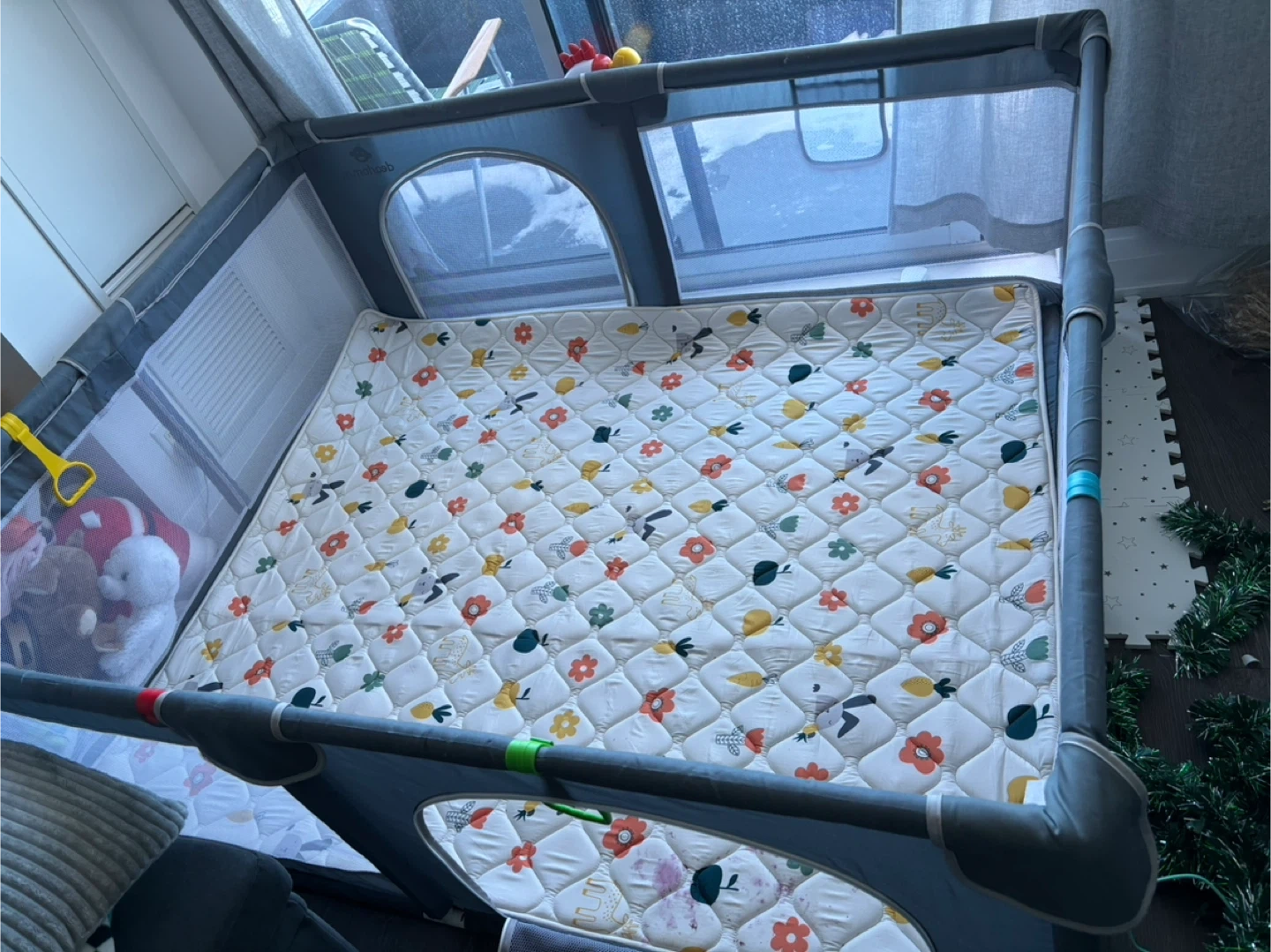 Grey toddler playpen with a colourful patterned mat. It has mesh sides for visibility and a zippered door. This playpen is great for keeping little ones safe while they play.