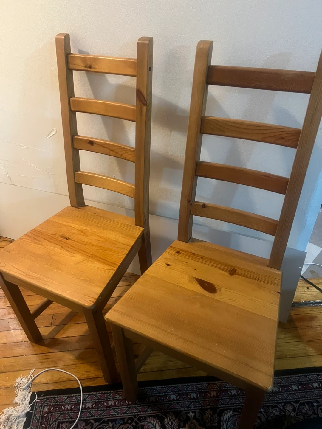 This listing is for two wooden dining chairs. They're made of solid pine wood with a natural finish. These chairs feature a ladder-back design. Sturdy and in great shape, I just don’t have space for them. Selling for $15 a piece.