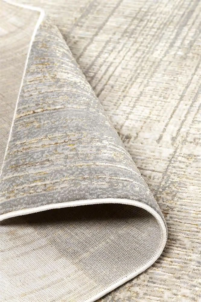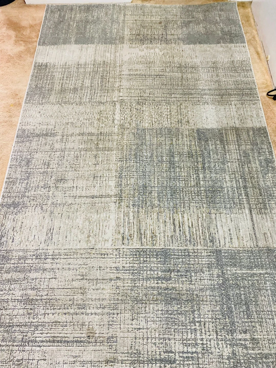 Stylish Aura area rug with a modern design. Features a blend of grey and cream tones. Made with polypropylene material for durability. Rug dimensions are 5'3" x 7'6".