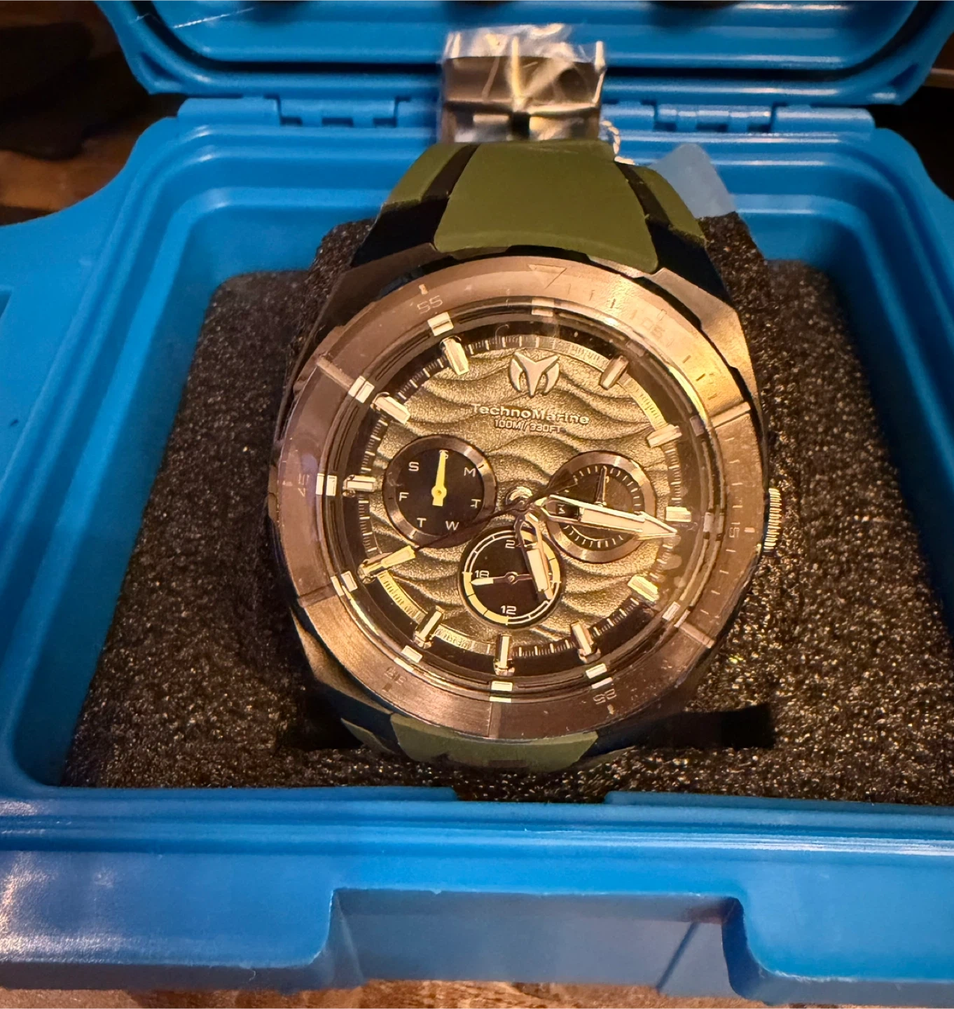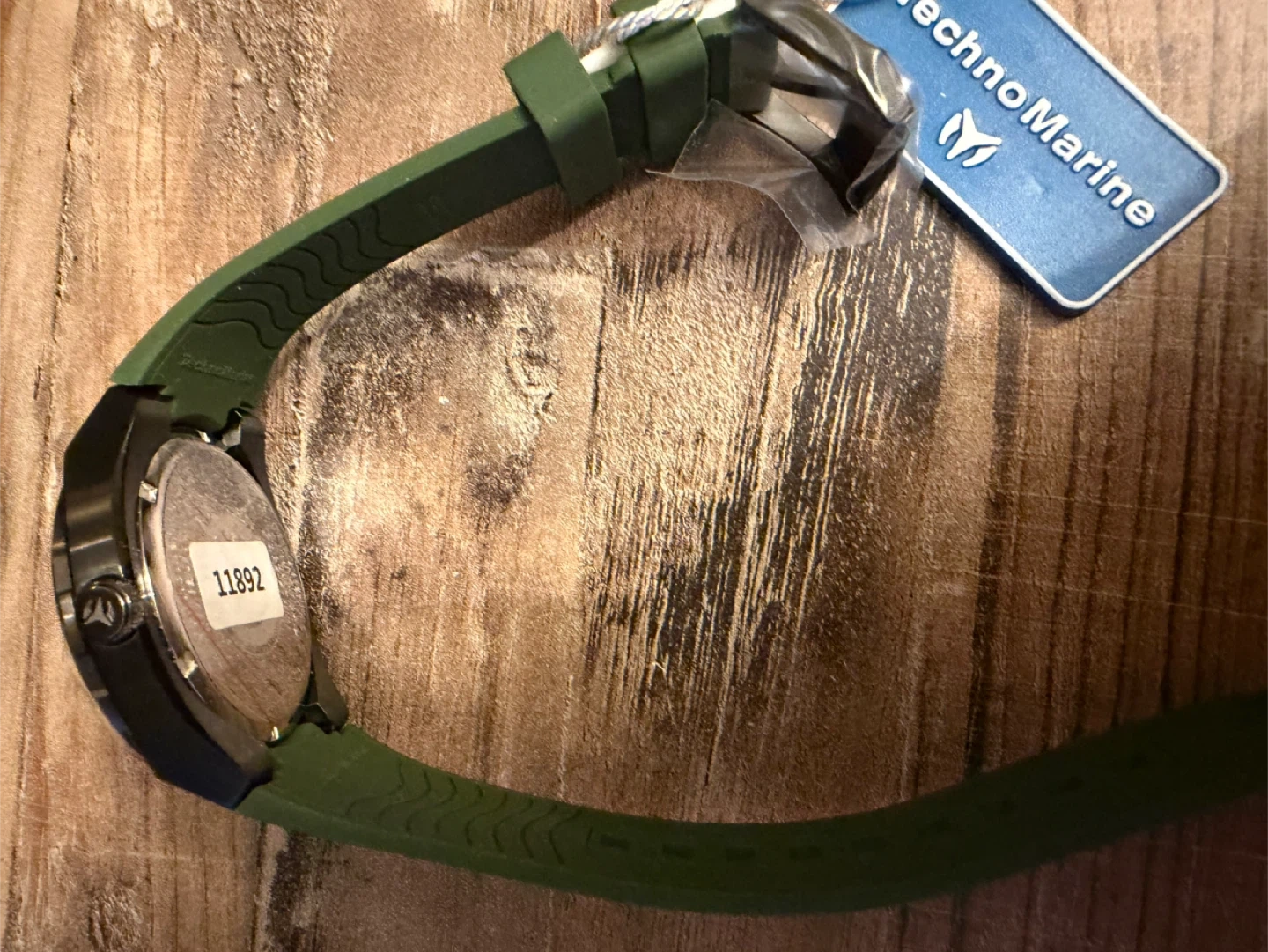 This TechnoMarine watch is the Cruise Legend model. It features a 100 m water resistance rating, making it suitable for swimming. The watch is made of stainless steel with a green silicone band. Comes in its original packaging.