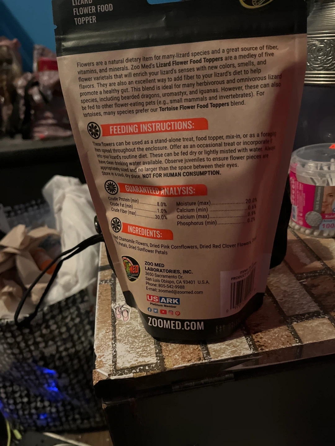 Lizard Flower Food Topper is a natural dietary item for many lizard species. It's a source of fiber and floral varietals that enrich your lizard's senses. This blend is ideal for herbivorous and omnivorous lizards, including bearded dragons, uroamystics, and iguanas.