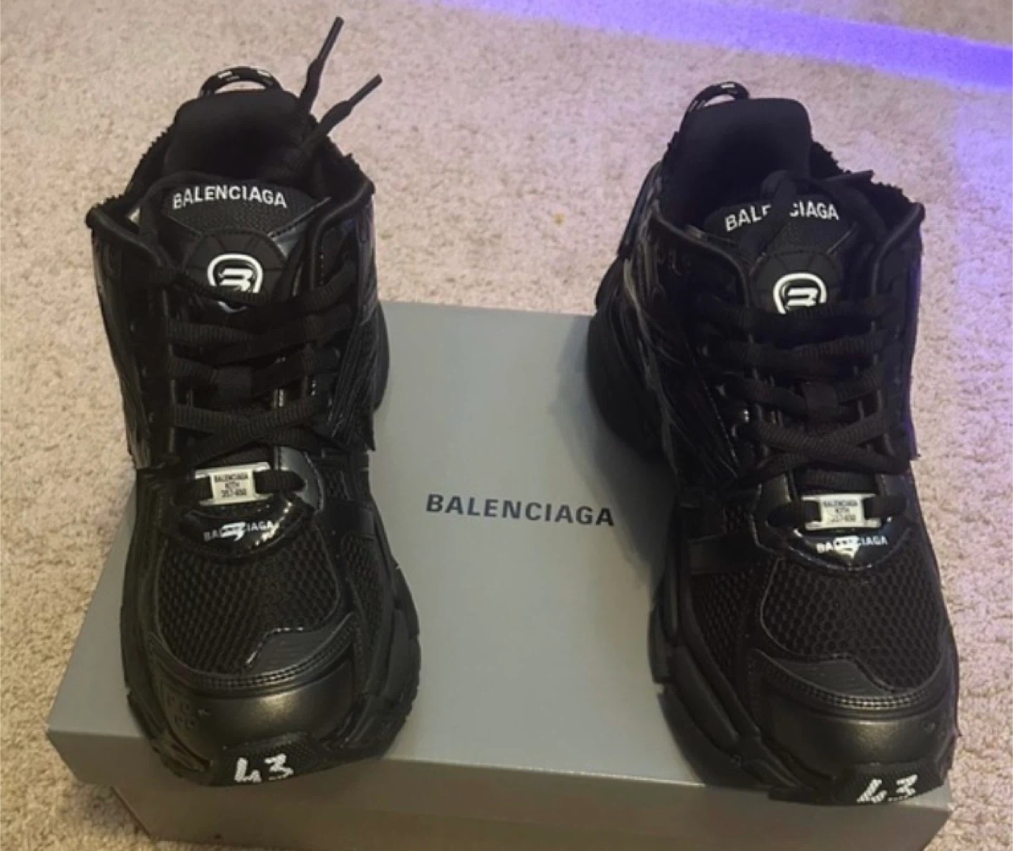 Black Balenciaga sneakers with a size tag of '43' on the toe box. These shoes are black and come with their original box. They're made of mesh and synthetic materials.