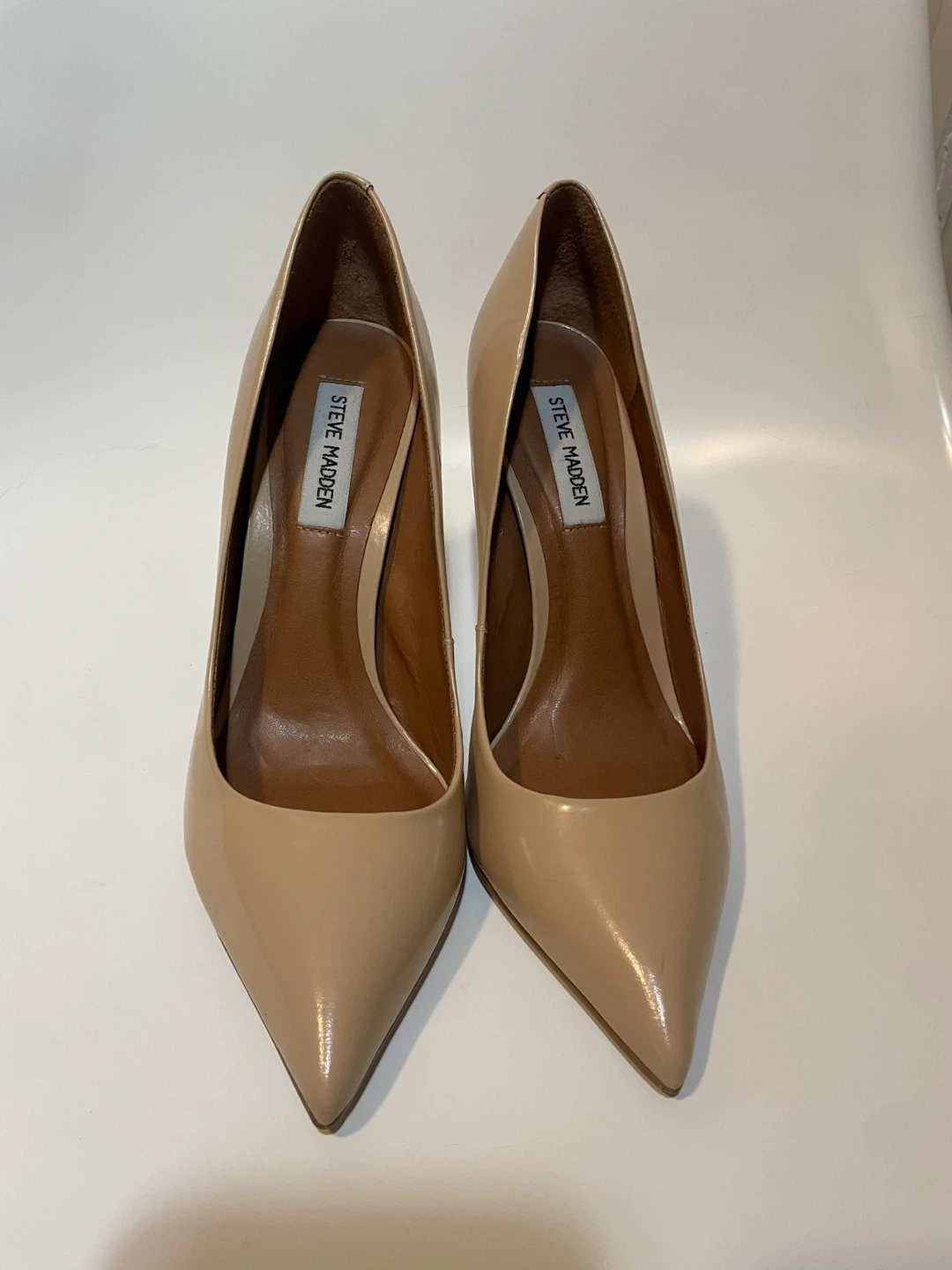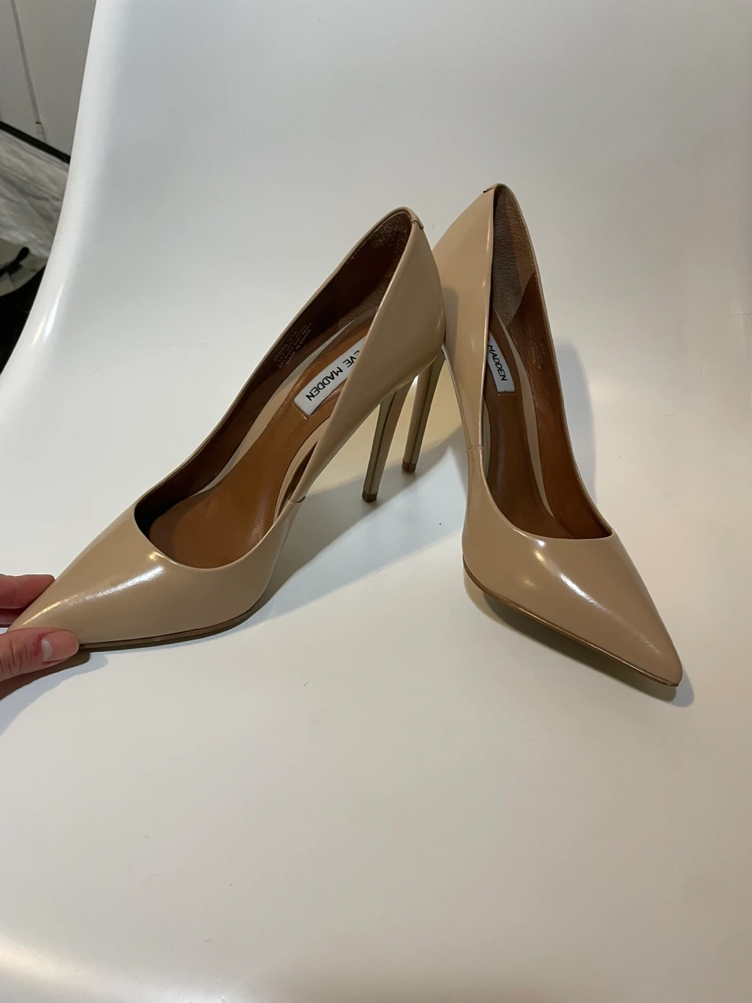 These Steve Madden pumps are made of nude patent leather. They have a pointed toe and a stiletto heel. These shoes are a versatile addition to any wardrobe!