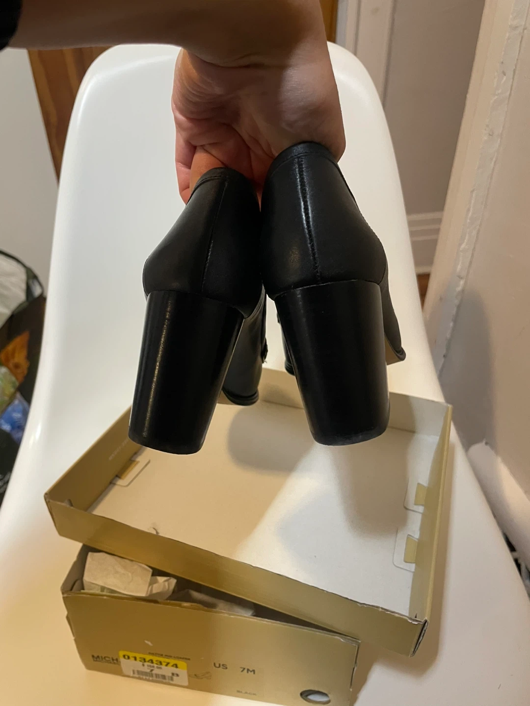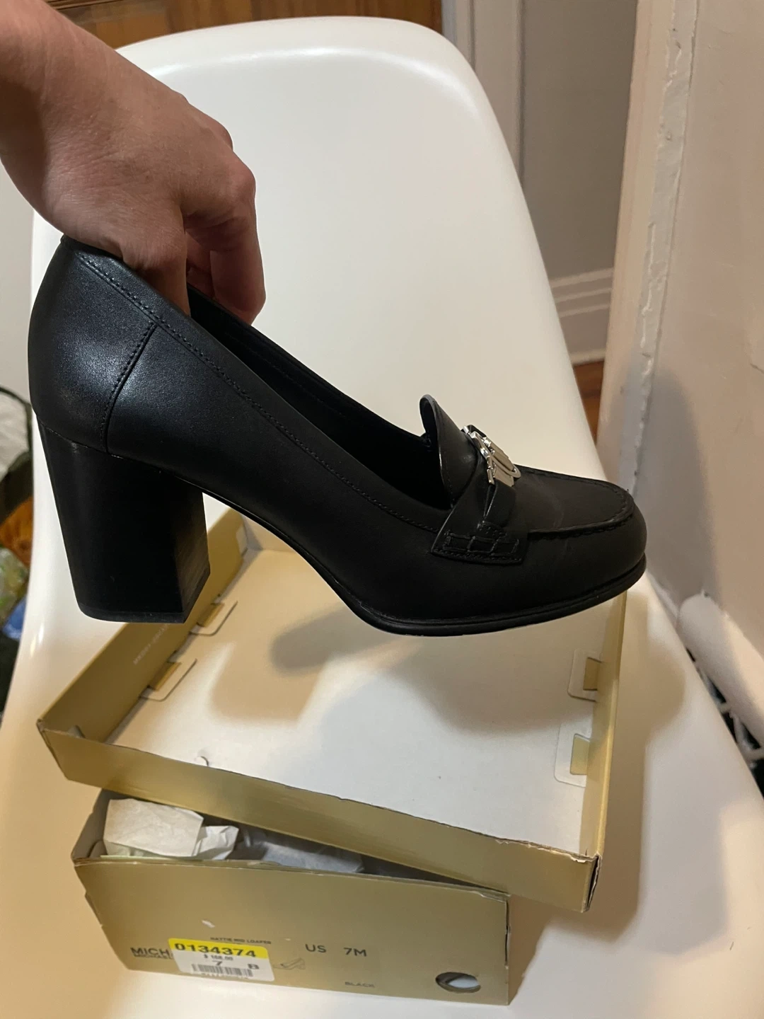Michael Kors women's black leather loafer heels. Features a silver-tone MK logo embellishment. Includes original box. Size 7 US.