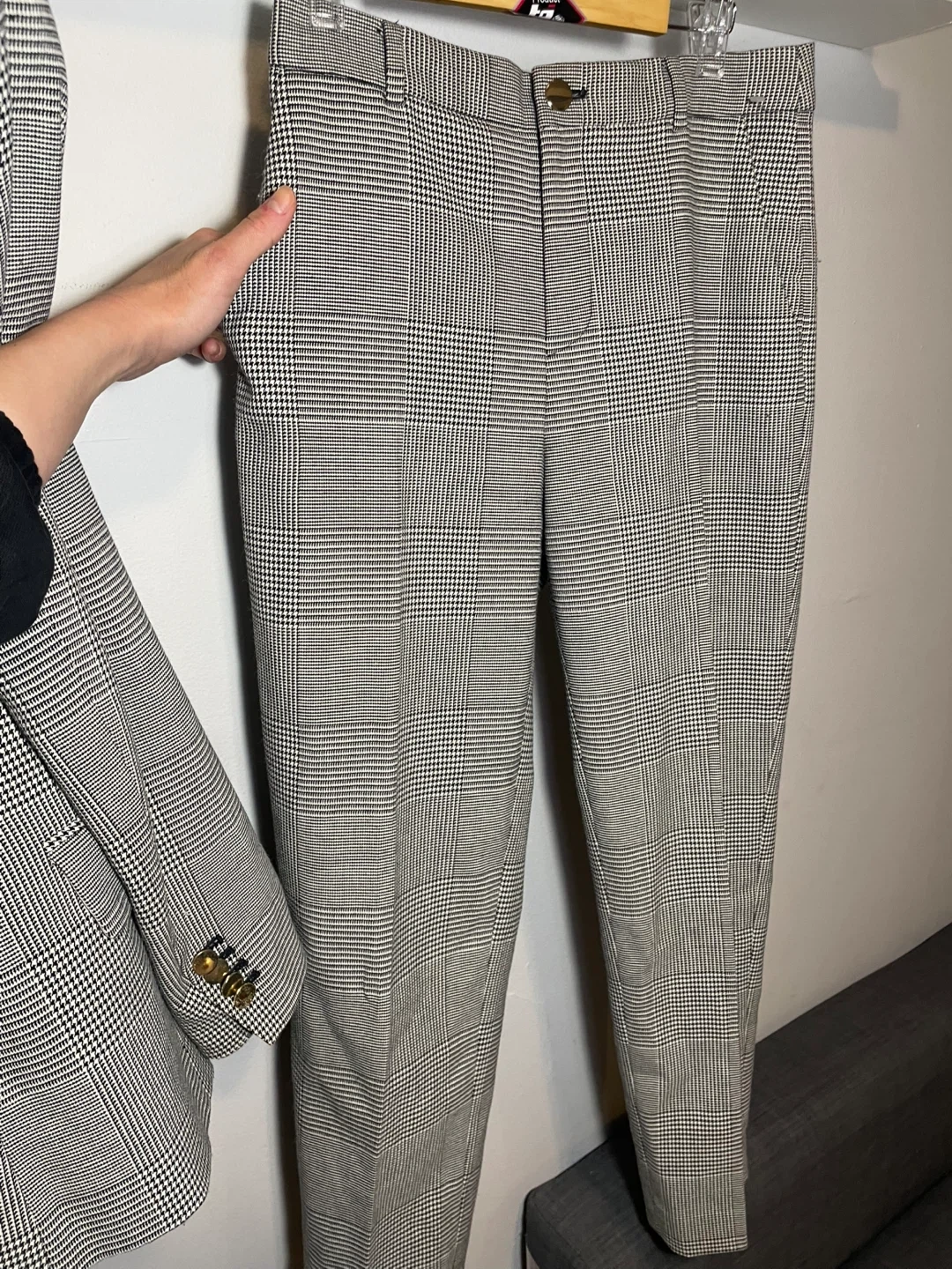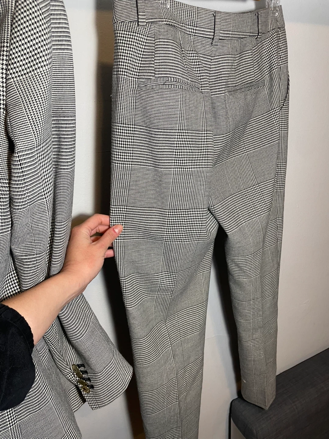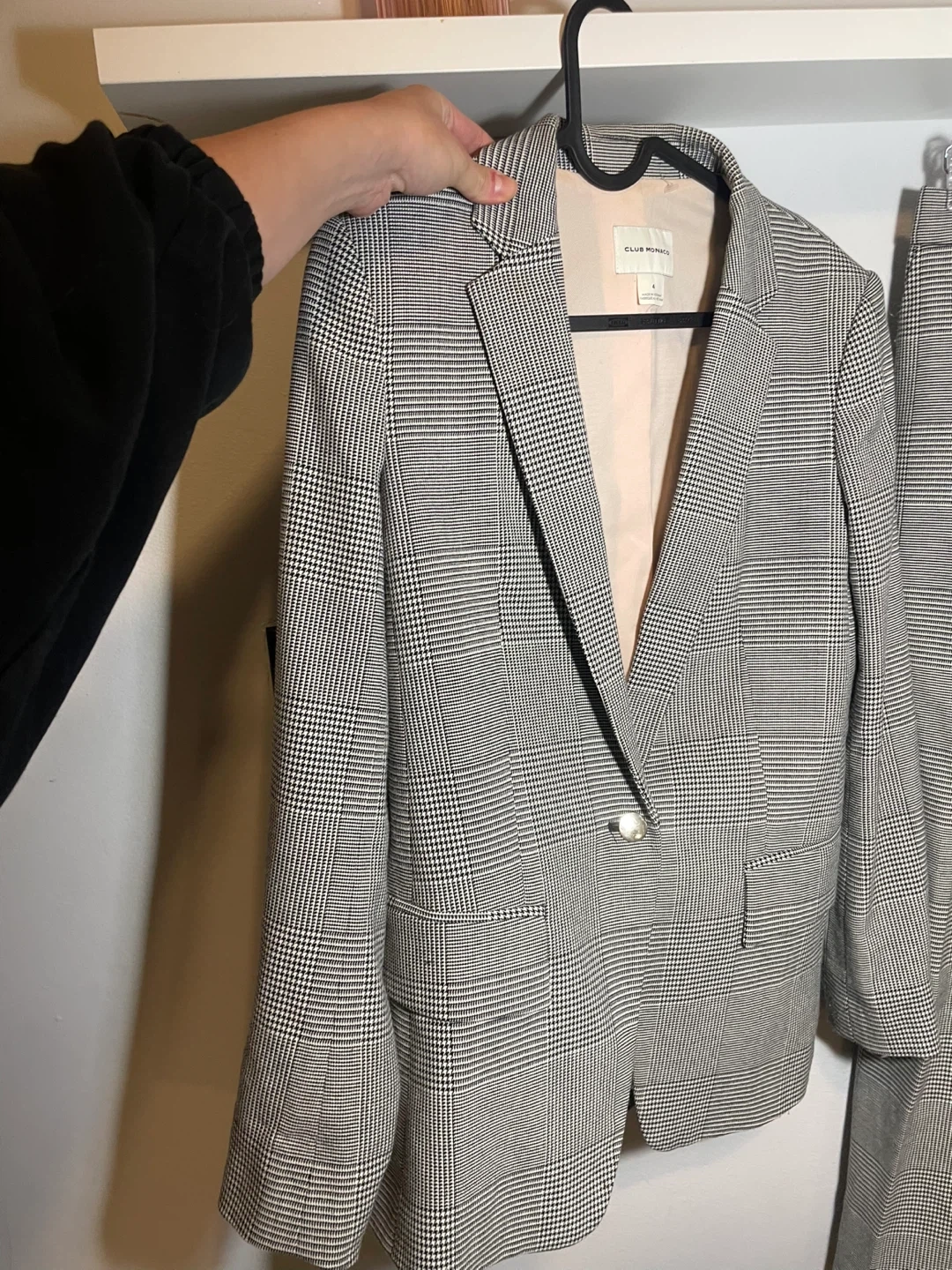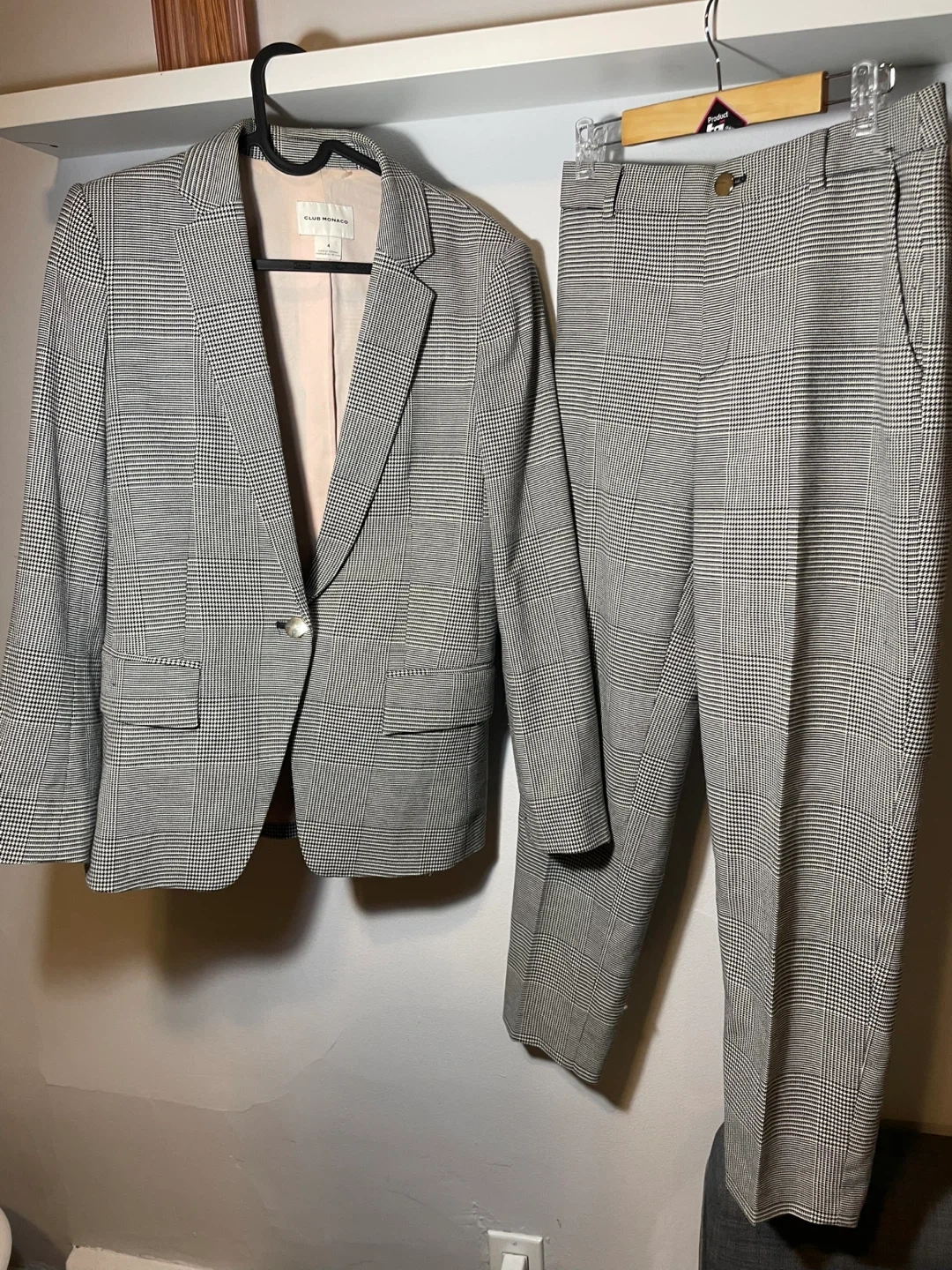This is a two-piece set from Club Monaco, featuring a plaid pattern. It includes a blazer and matching pants. Blazer size is 4 Pants size 2.