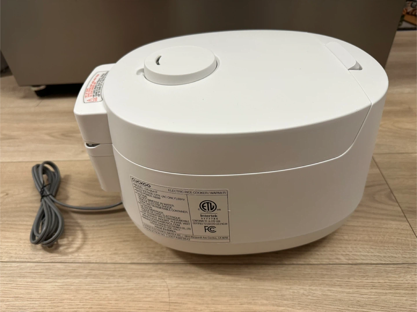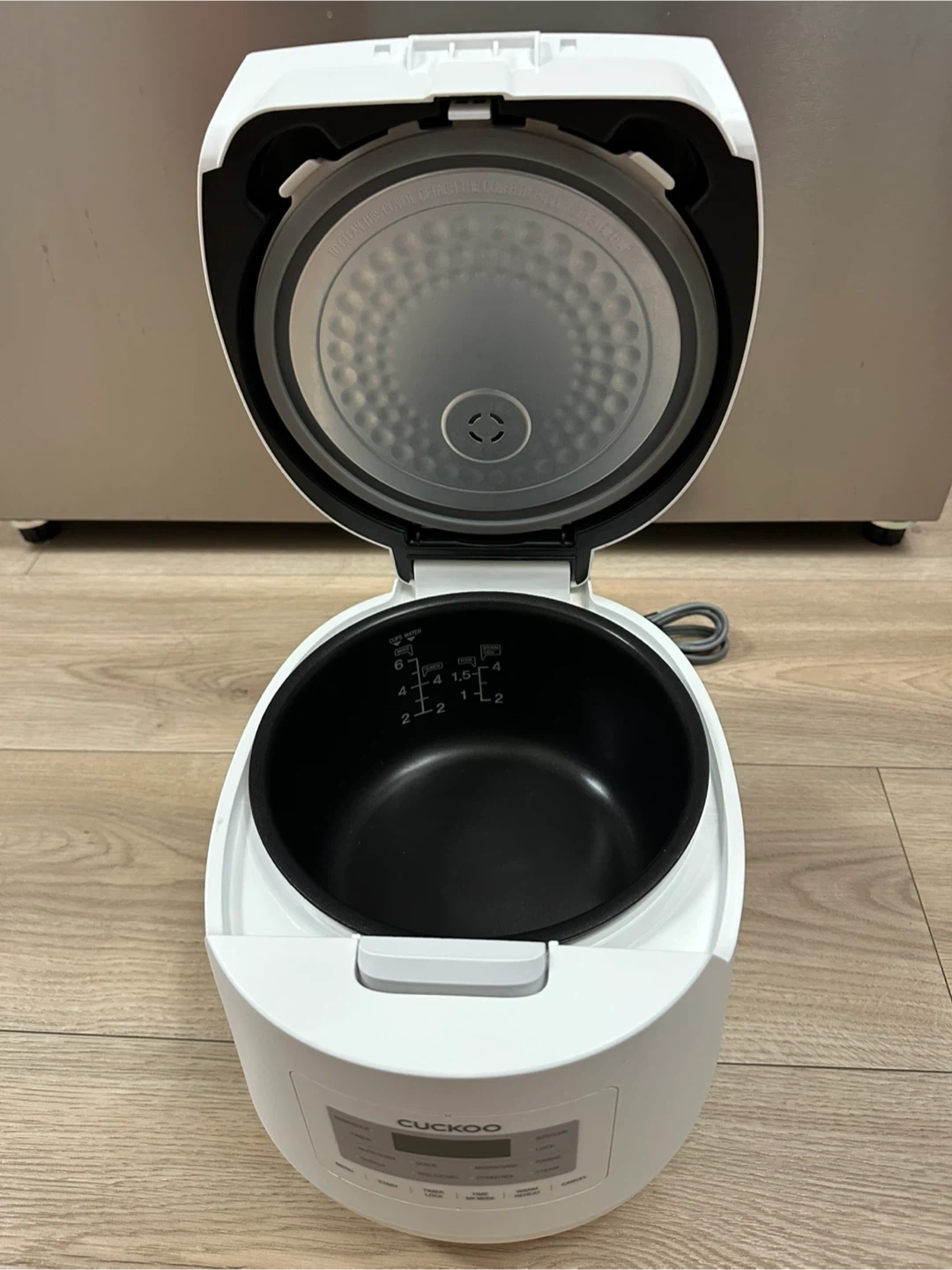 This is a white Cuckoo electric rice cooker and warmer. It has multiple cooking functions including Quick, Sushi, Brown/GABA, and Steam. The inner pot is non-stick.