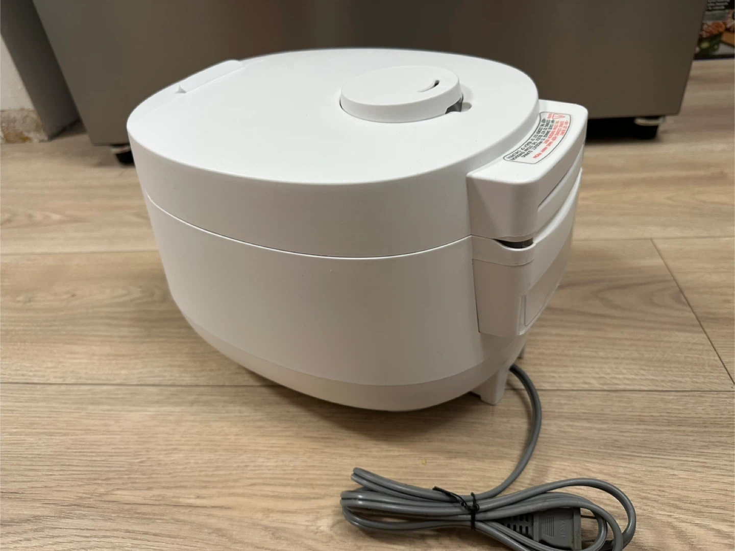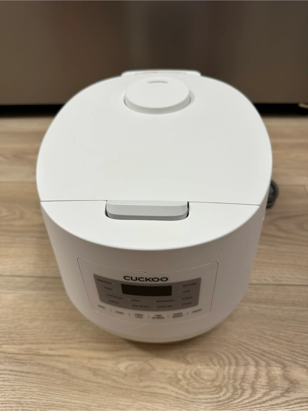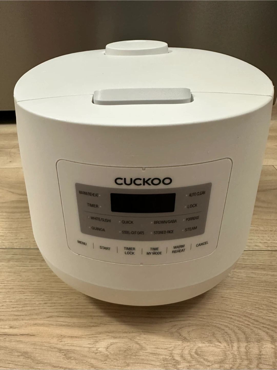 This is a white Cuckoo electric rice cooker and warmer. It has multiple cooking functions including Quick, Sushi, Brown/GABA, and Steam. The inner pot is non-stick.