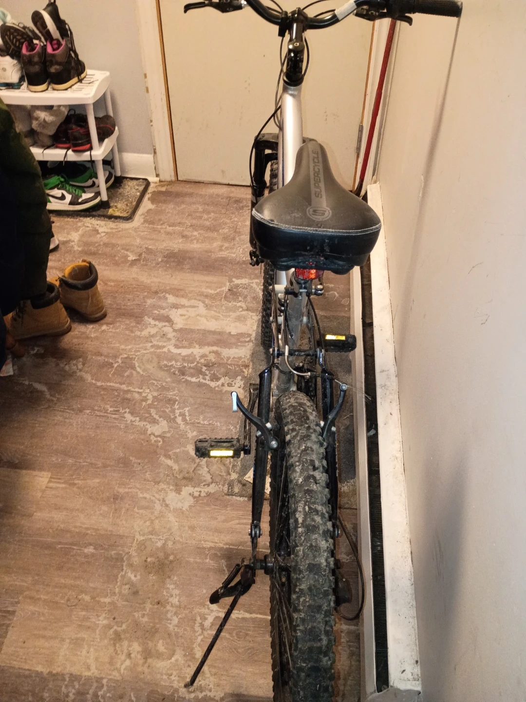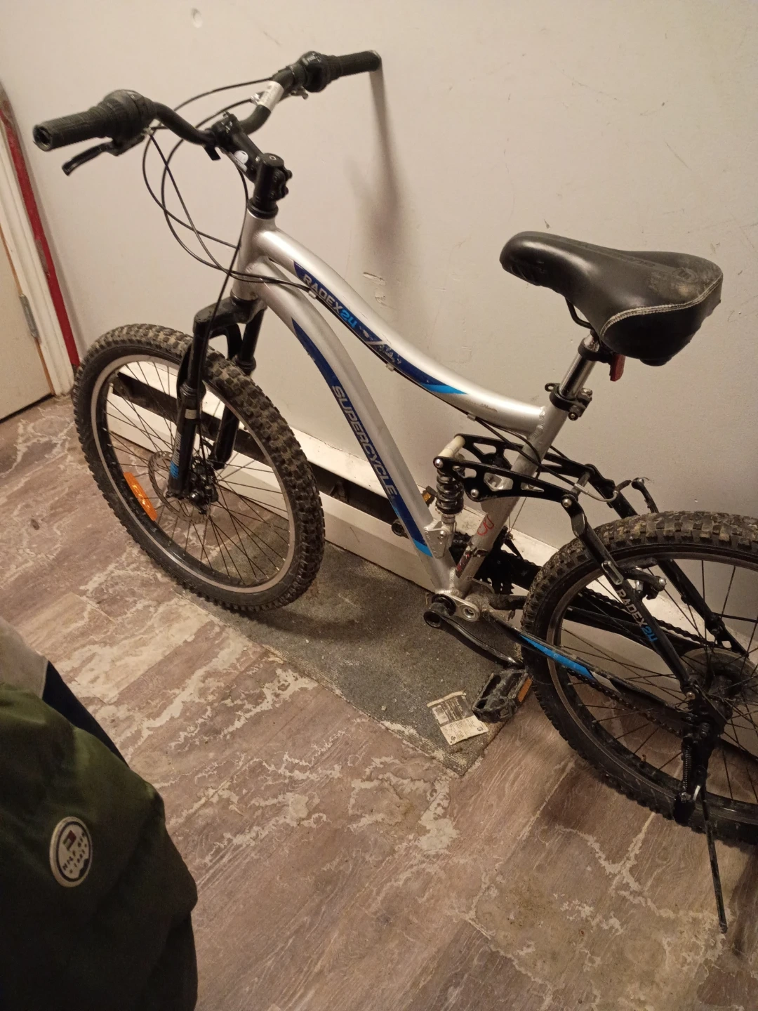 Silver Supercycle mountain bike with blue accents. Full suspension model. Great for trails! Need gone pick up only