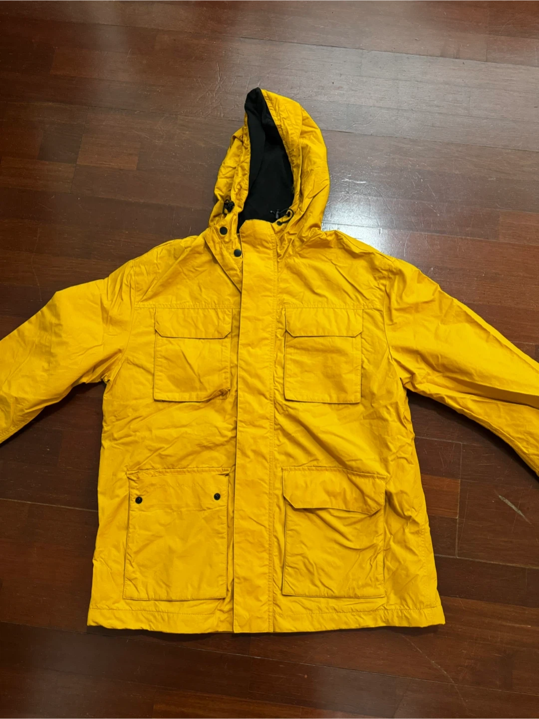 H&M yellow hooded jacket with a black lining. It's windproof and has multiple front pockets. Great for layering on cooler days!