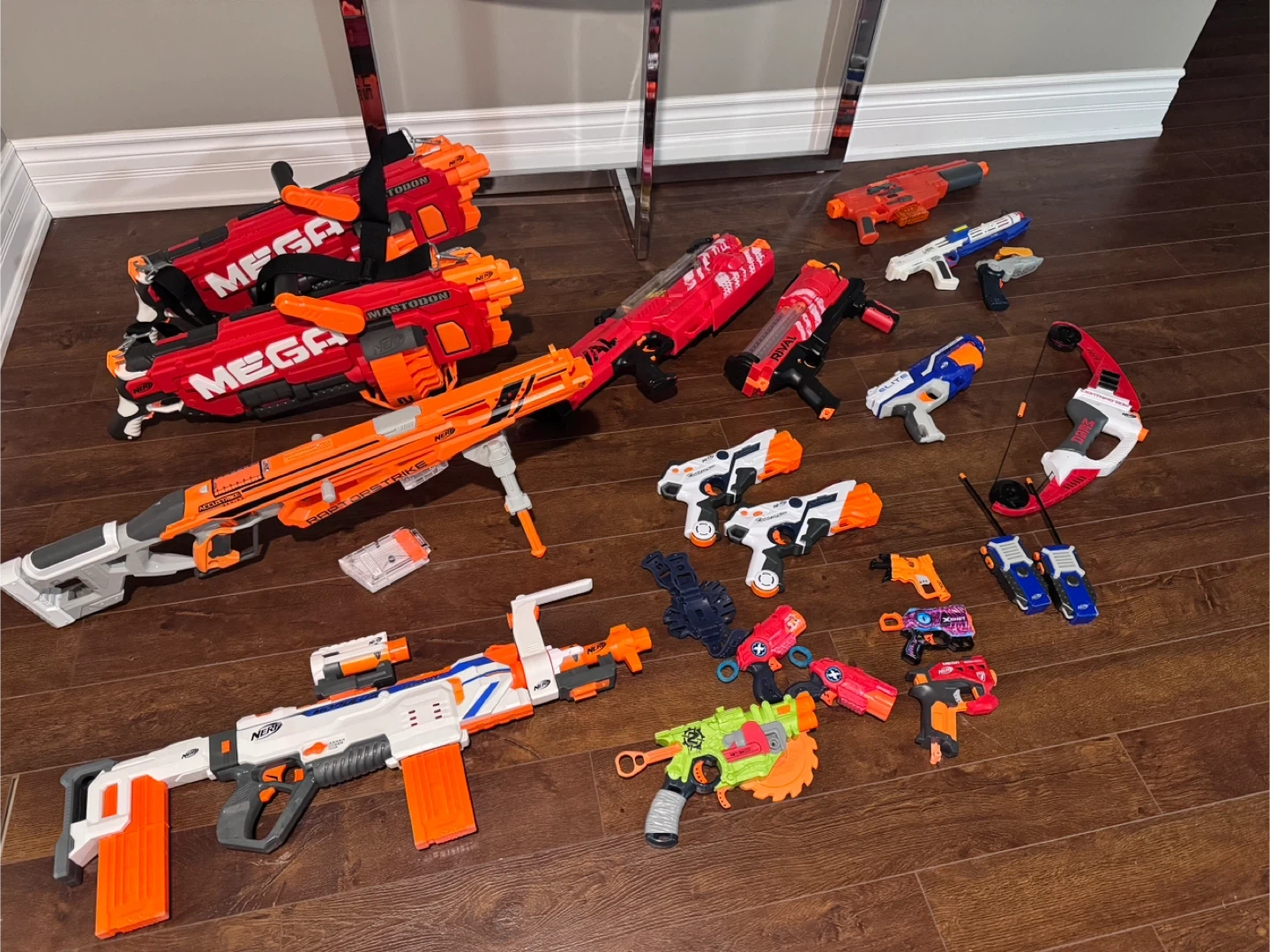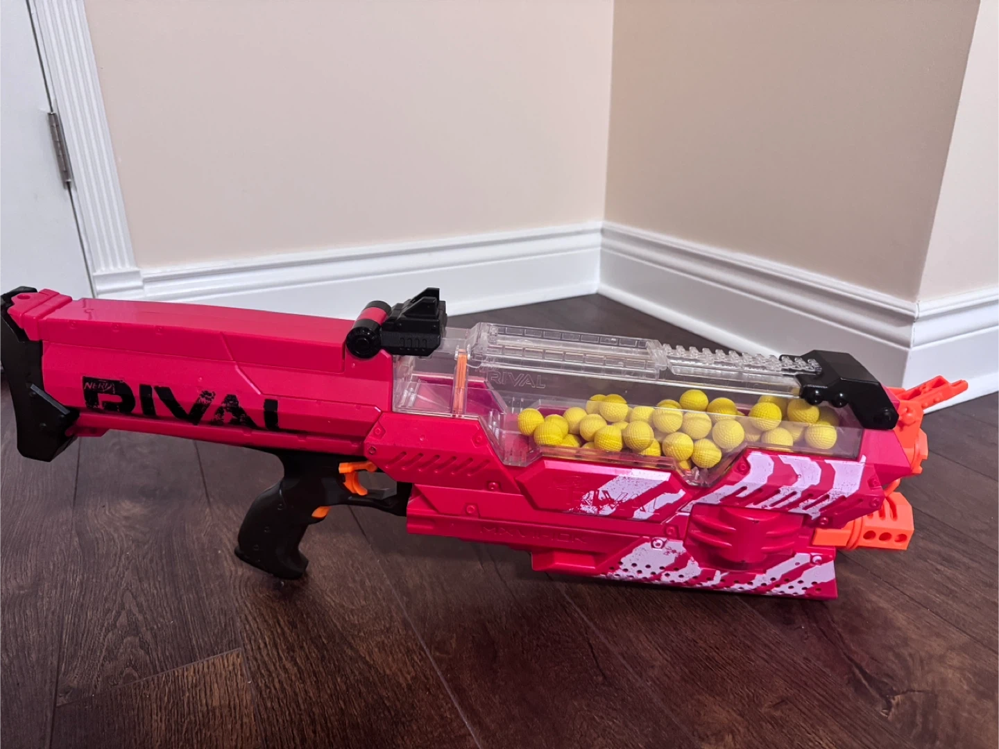 This is the Nerf Rival Nemesis MXVII-10K blaster. It's a fully motorized blaster that can shoot 100 rounds. The blaster includes the hopper and some Rival rounds.