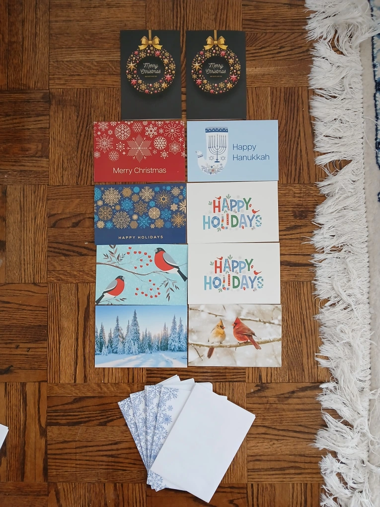 A collection of festive greeting cards for the holiday season! Includes Merry Christmas, Happy Hanukkah, and general Happy Holidays designs. Comes with matching envelopes.