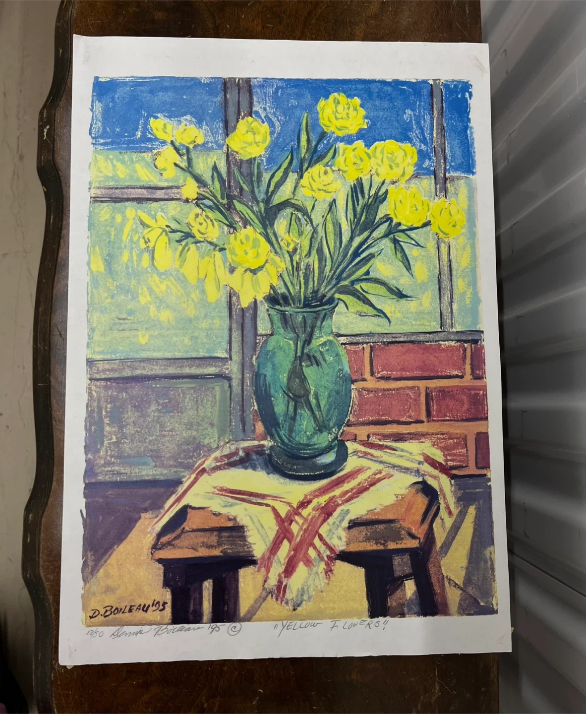 This is a limited edition print titled 'Yellow Flowers' by D. Boileau, created in 1995. It's print number 13 out of a series of 50. The artwork depicts a vase of yellow flowers against a brick wall and window background.