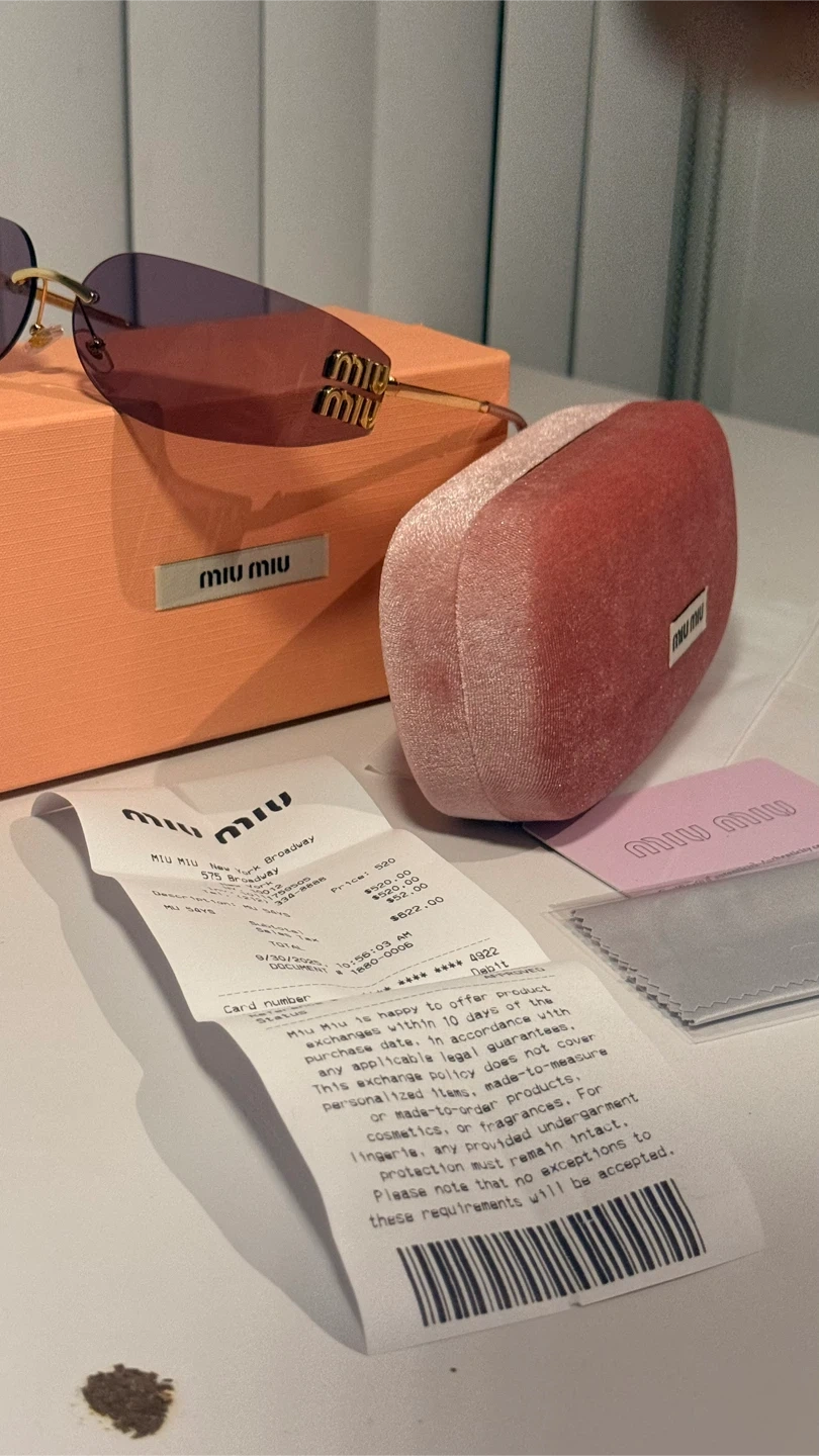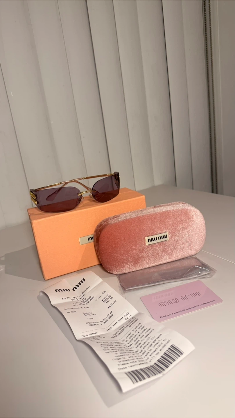 These Miu Miu sunglasses feature a stylish rimless design with purple lenses and gold-toned detailing. They come with the original box, case, cleaning cloth, and authenticity card. Made in Italy.