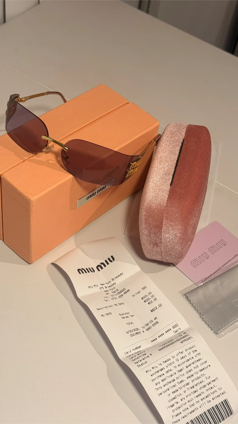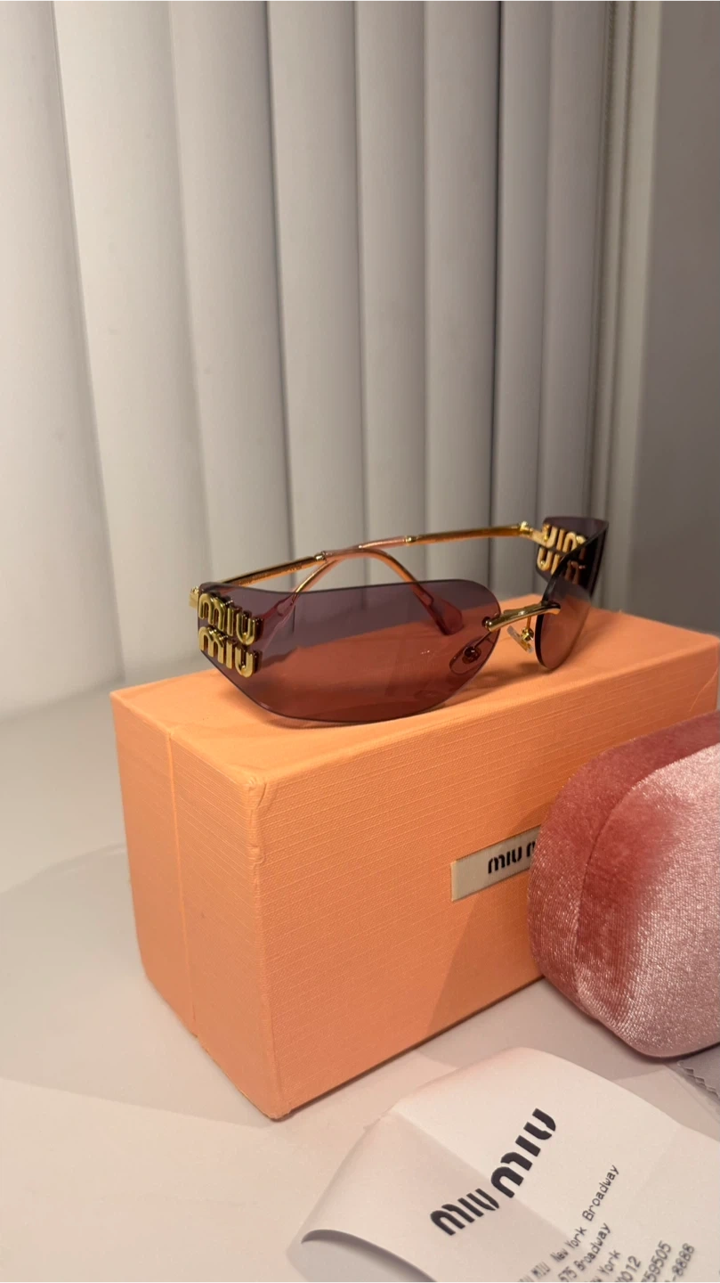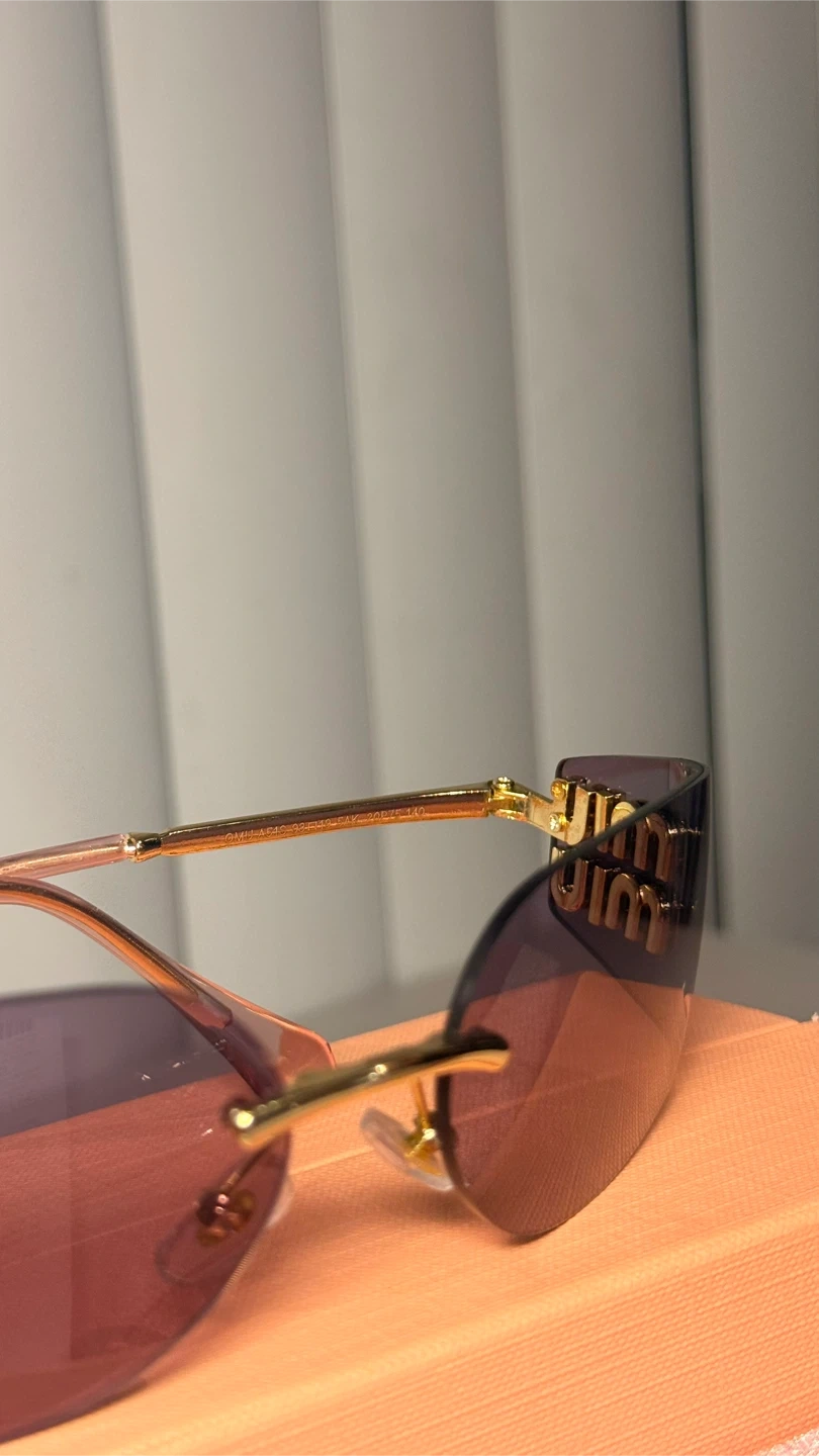 These Miu Miu sunglasses feature a stylish rimless design with purple lenses and gold-toned detailing. They come with the original box, case, cleaning cloth, and authenticity card. Made in Italy.
