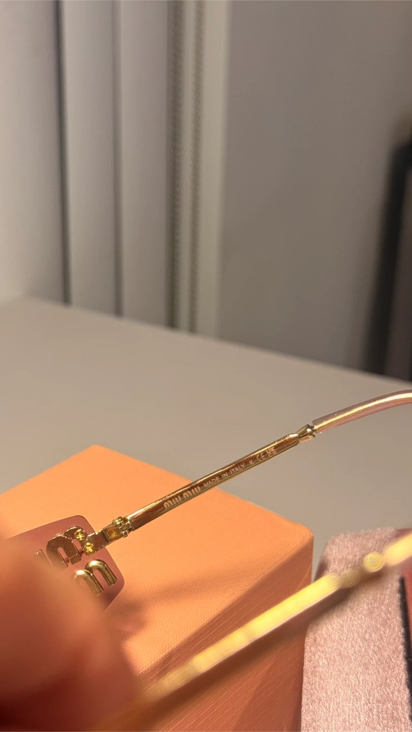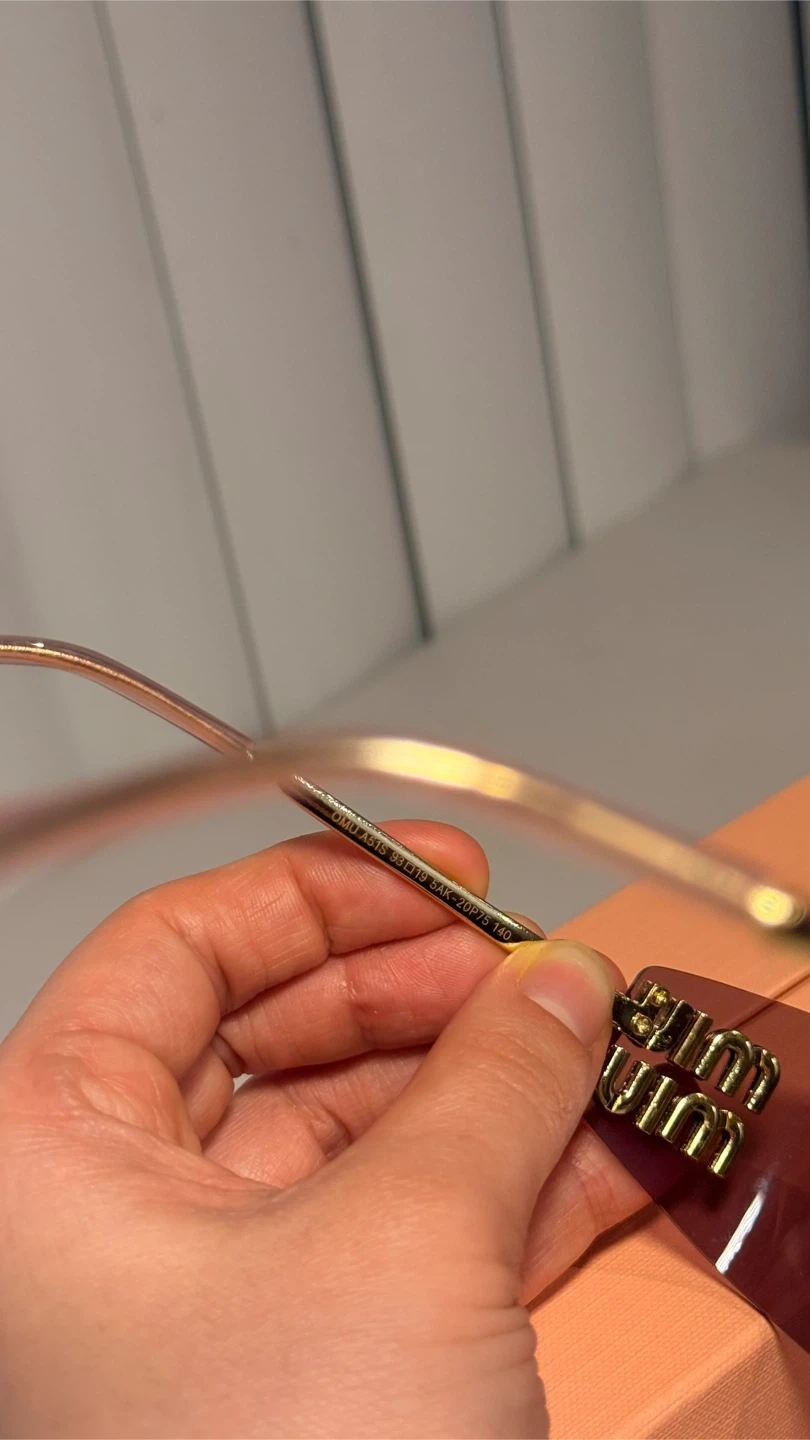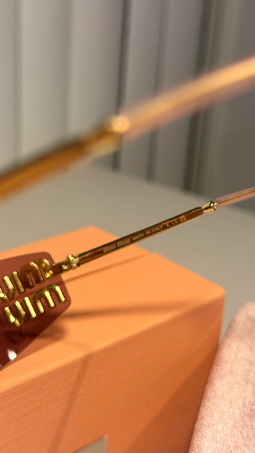 These Miu Miu sunglasses feature a stylish rimless design with purple lenses and gold-toned detailing. They come with the original box, case, cleaning cloth, and authenticity card. Made in Italy.