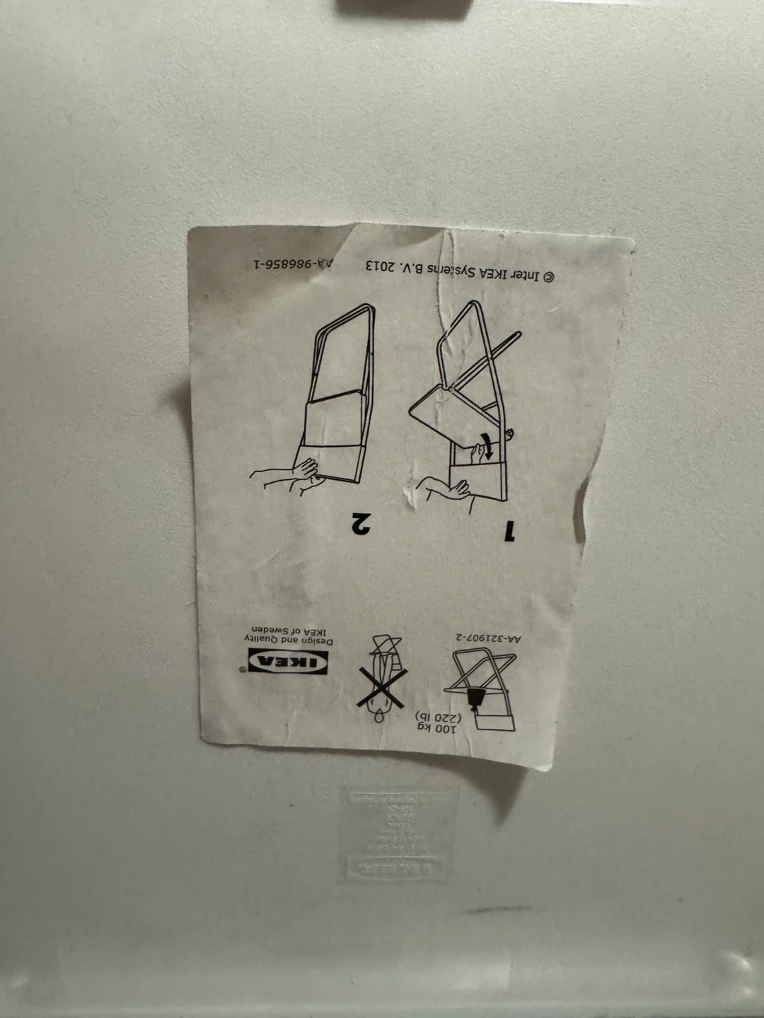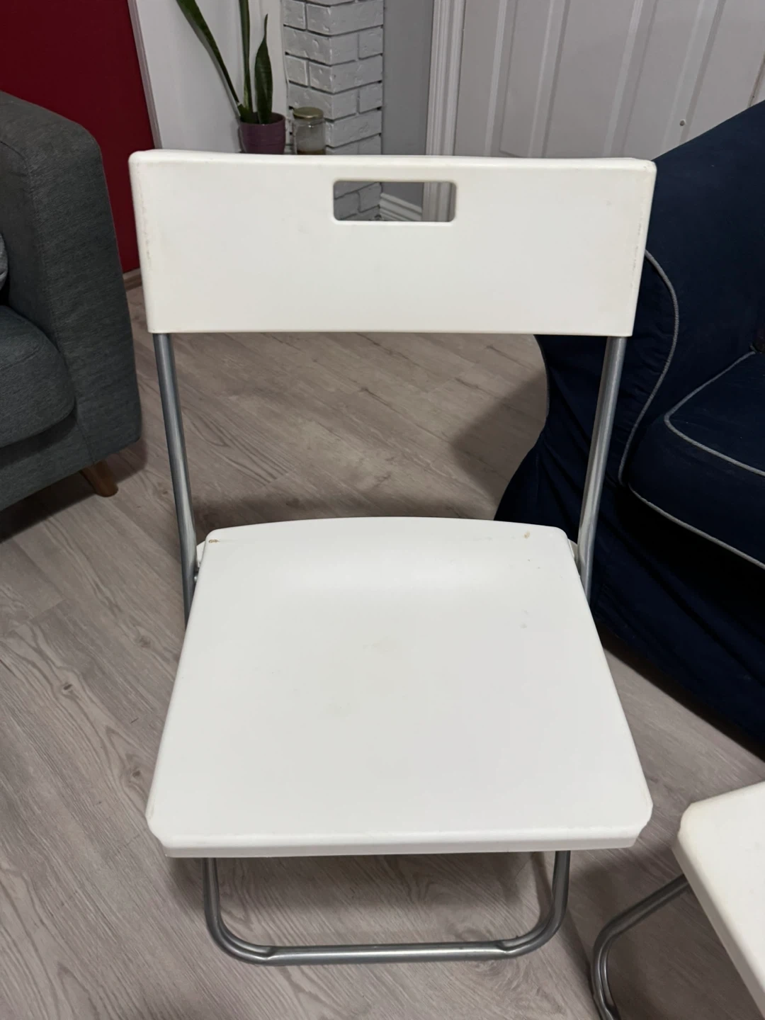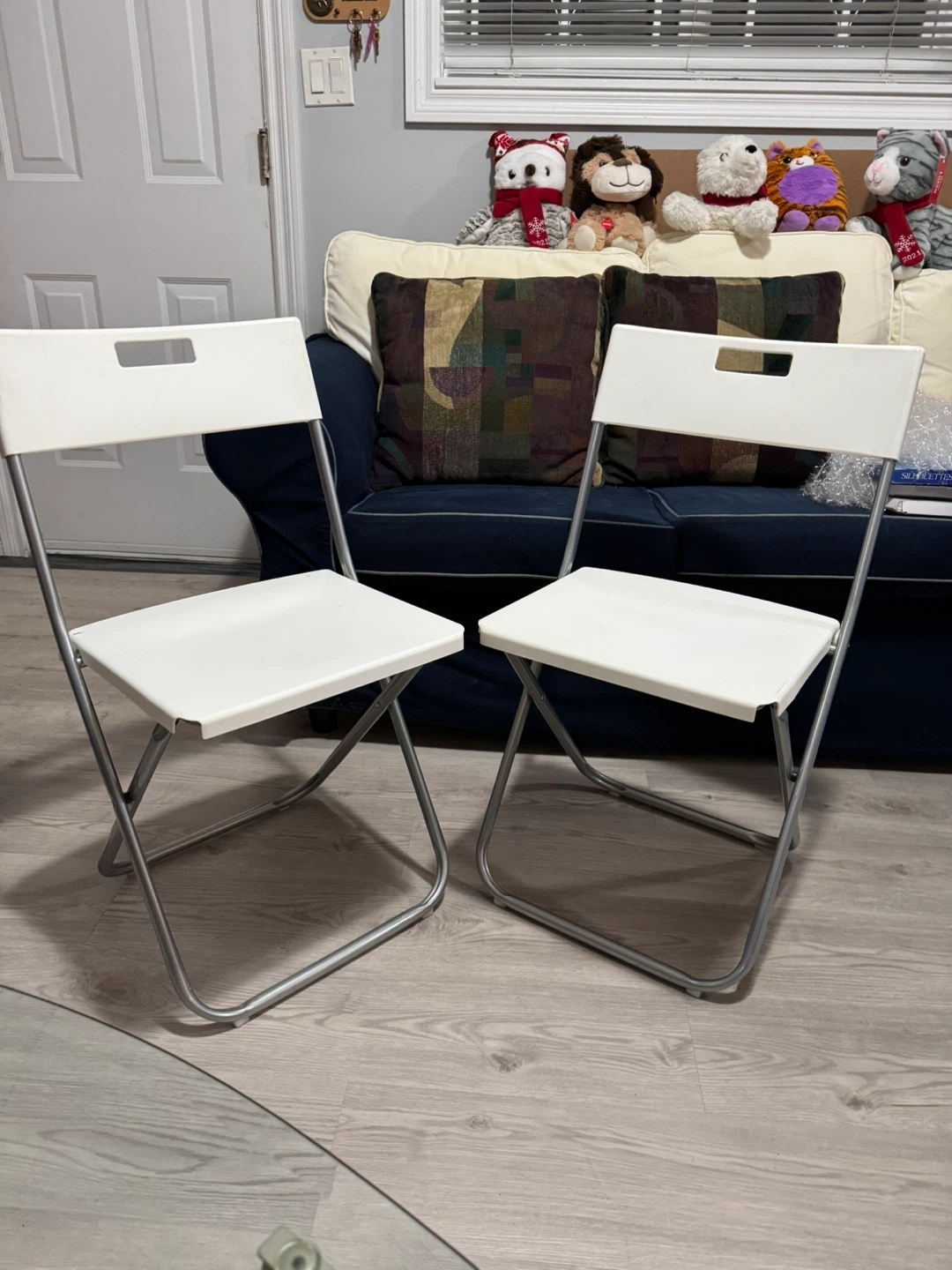 These are two white IKEA folding chairs with metal frames. They fold flat for easy storage. Pick up at east 41st Victoria drive Area Vancouver. Cash only.