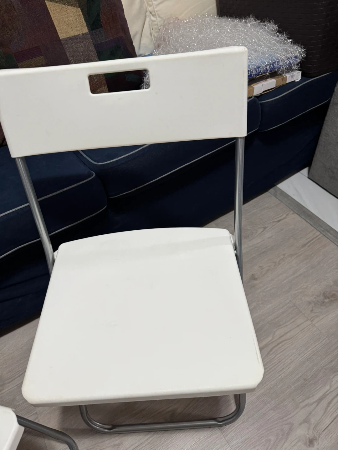 These are two white IKEA folding chairs with metal frames. They fold flat for easy storage. Pick up at east 41st Victoria drive Area Vancouver. Cash only.