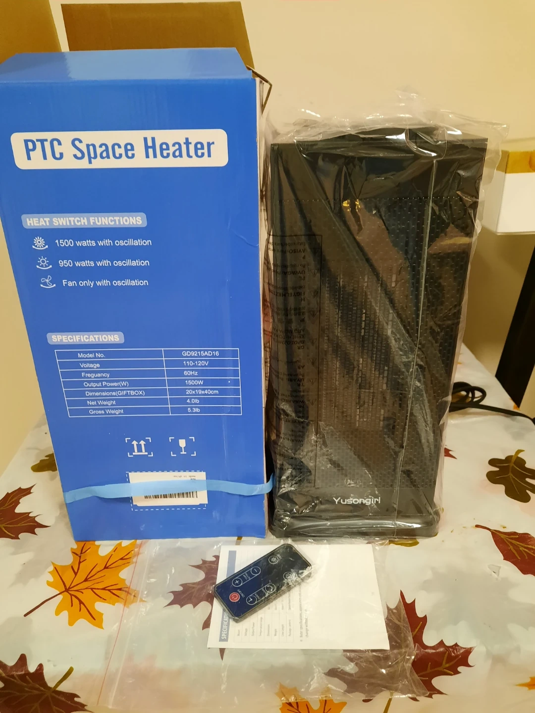 This is a brand new PTC space heater offers 1500 watts with oscillation or 950 watts with oscillation. It also has a fan-only mode with oscillation. Dimensions are 20x19x40cm. Includes a remote. Bought this last week. Moving to a different country so selling it.