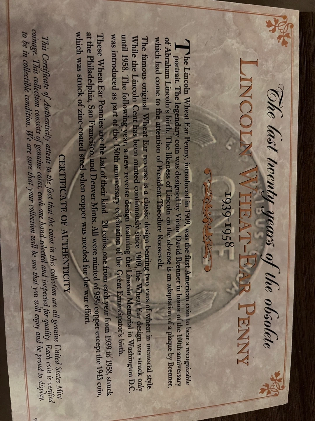 Collection of Lincoln Wheat-Ear Pennies featuring the last twenty years of their production from 1939 to 1958. Includes coins struck from 1939 to 1958, with all mints represented. All coins are genuine United States Mint coinage. Each coin is hand-selected and inspected for quality. This collection consists of genuine coins, each one selected and inspected for quality. Each coin is certain to be in collectible condition.