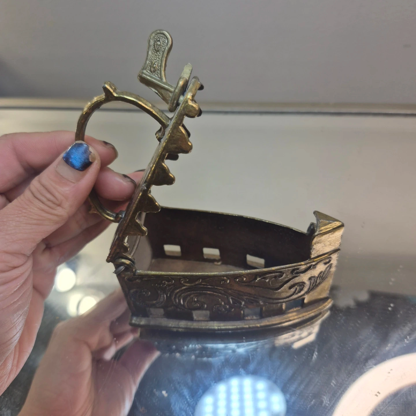 This is a charming miniature brass iron, perfect for display. It's made of metal and features decorative scrollwork. It's a unique decorative item or could be used as a unique holder.