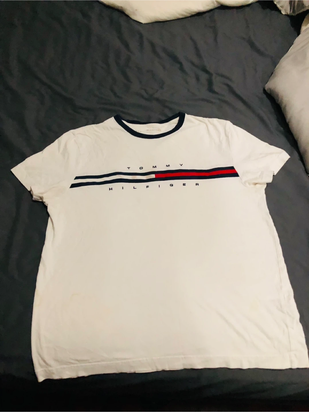 White short-sleeve t-shirt from Tommy Hilfiger. It has the signature stripe detail across the chest. Cotton