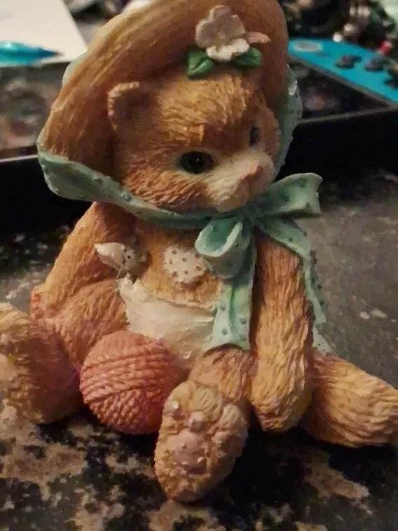 This is a charming collectible figurine of an orange tabby cat. It's dressed in a hat and a bow with a polka-dot patch on its chest and is sitting next to a ball of yarn. This piece would make a lovely addition to any cat lover's collection.