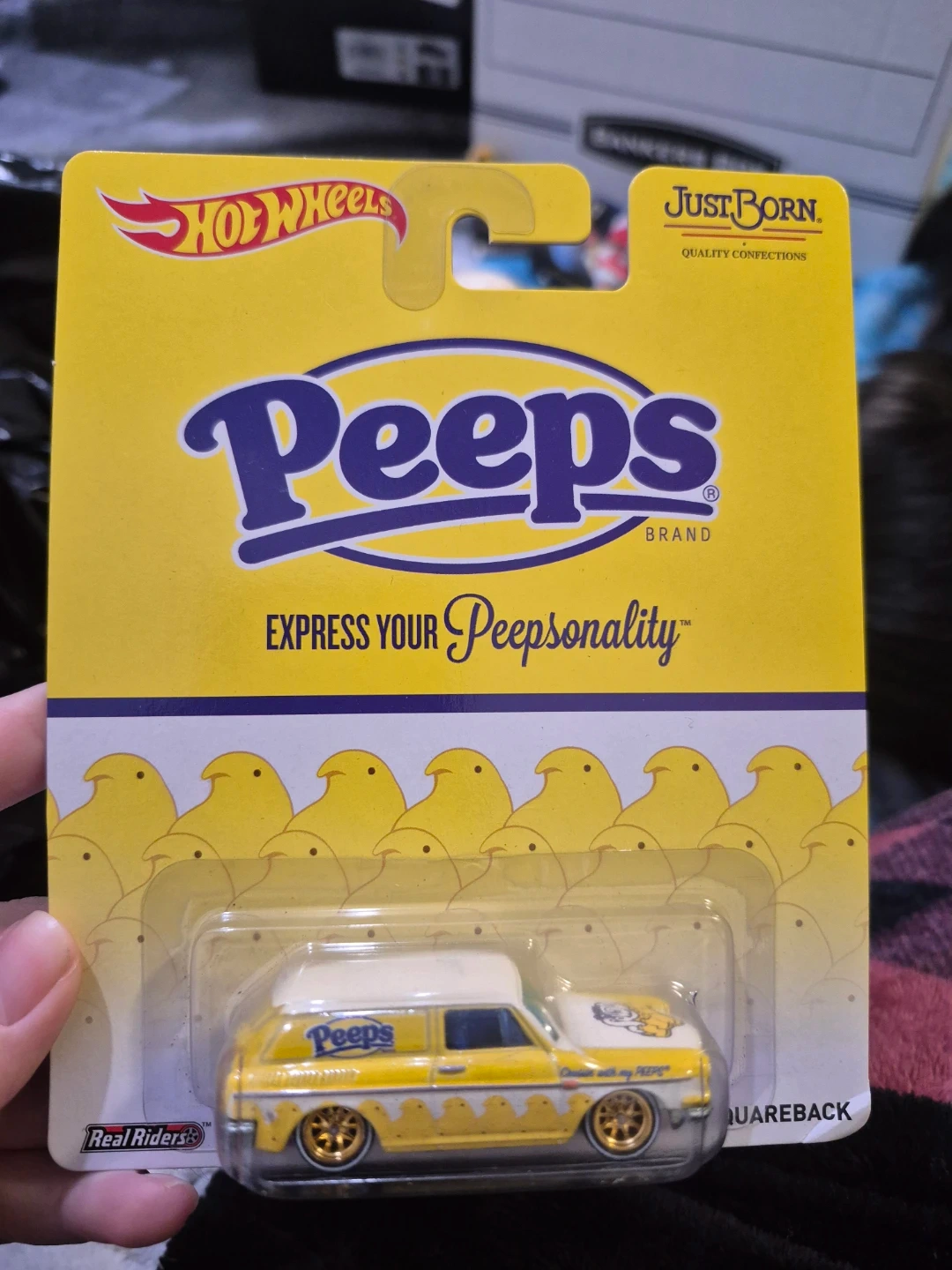 This Hot Wheels Premium die-cast features a custom '67 Ford Bronco Wagon themed after Peeps. It comes with Real Riders wheels and is ready to display. A fun collectible for fans of both brands!