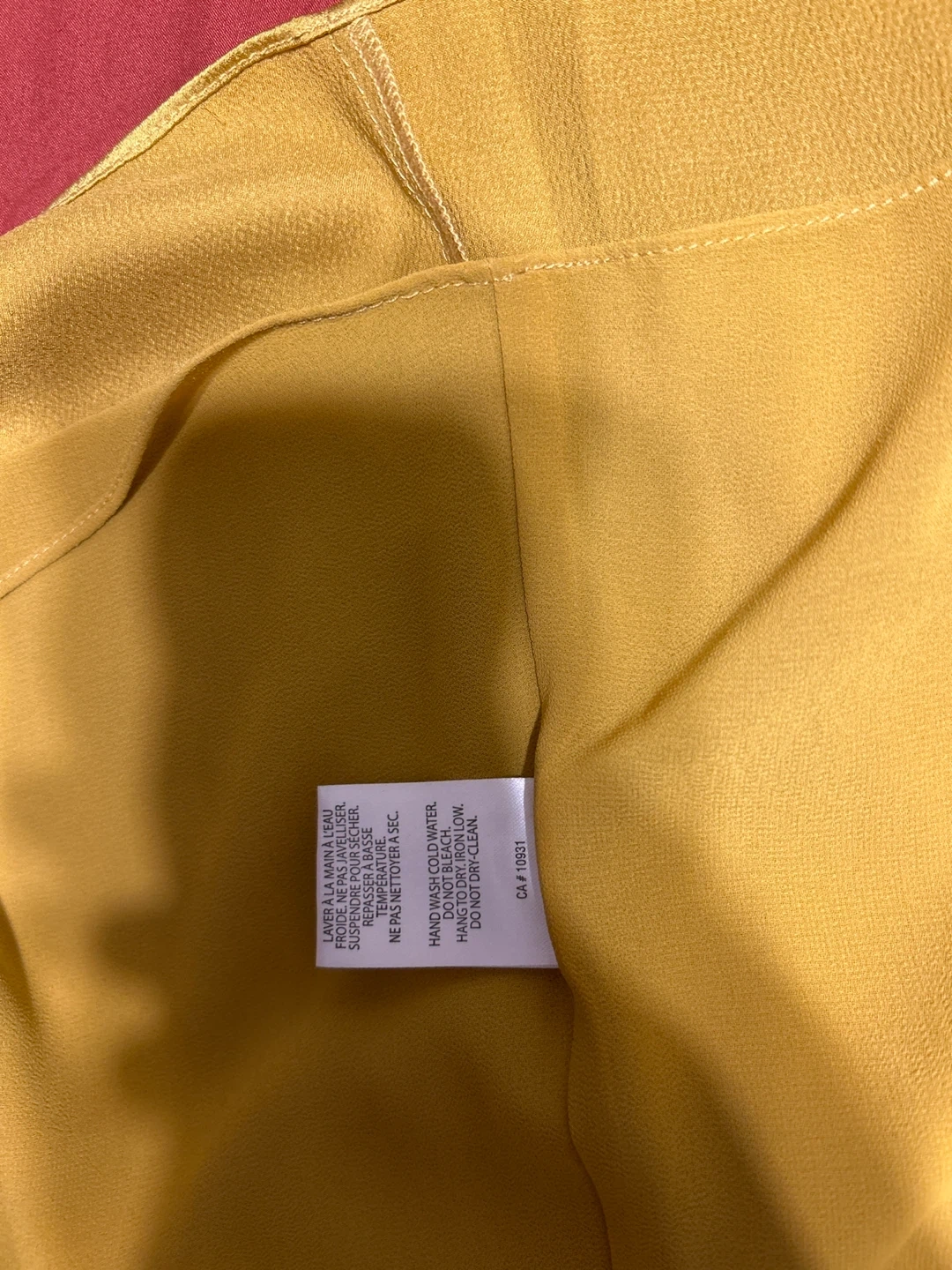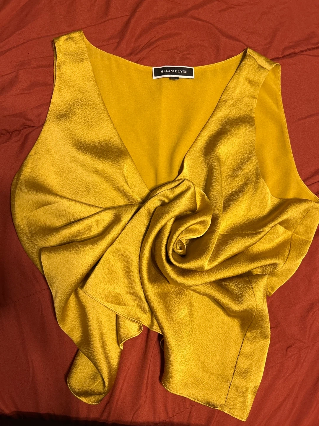 This is a sleeveless V-neck top from Melanie Lyne in a mustard yellow colour. It's made with a silky material. Hand wash cold, do not bleach, hang to dry, iron on low heat. Suitable for a stylish everyday look.it doesn’t have the size but letting you know is L