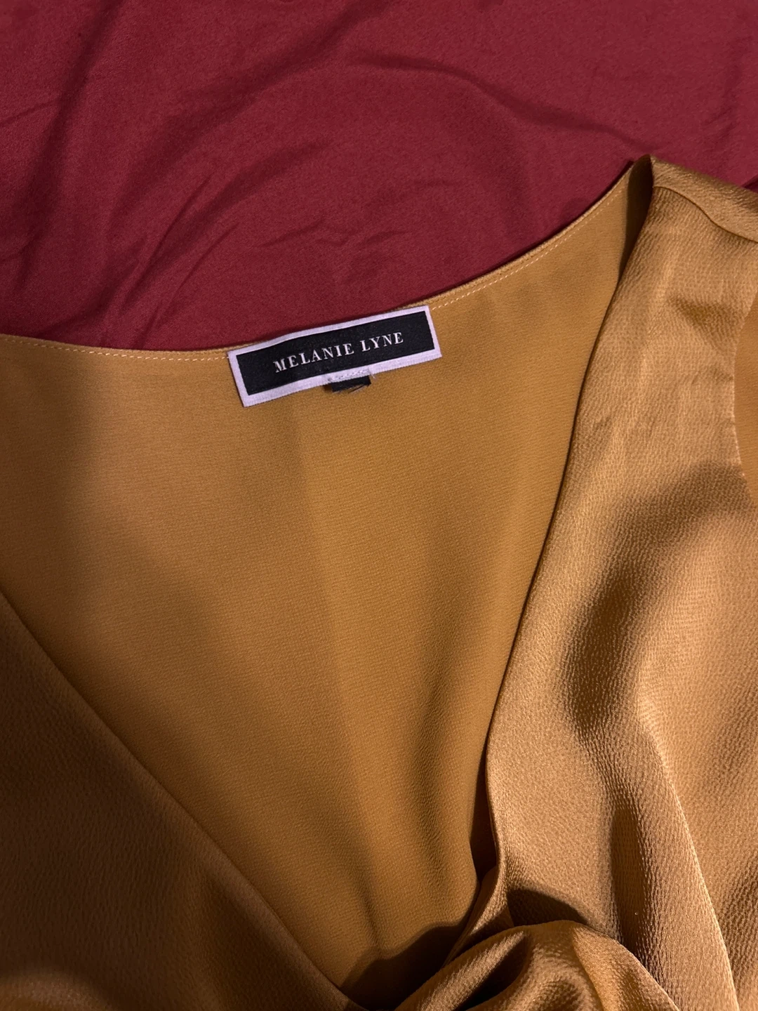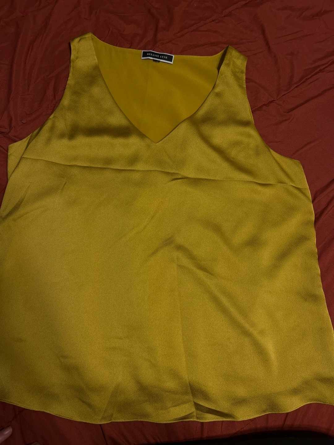This is a sleeveless V-neck top from Melanie Lyne in a mustard yellow colour. It's made with a silky material. Hand wash cold, do not bleach, hang to dry, iron on low heat. Suitable for a stylish everyday look.it doesn’t have the size but letting you know is L