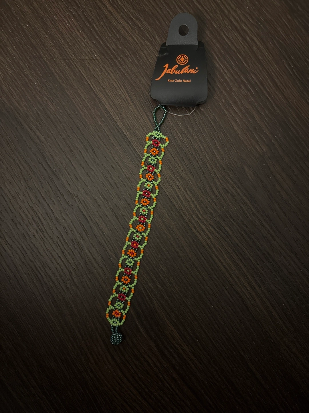 This Jabulani bracelet features a colourful beaded design with floral accents. It's made with small beads in shades of green, orange, and red. A lovely accessory for adding a pop of colour!