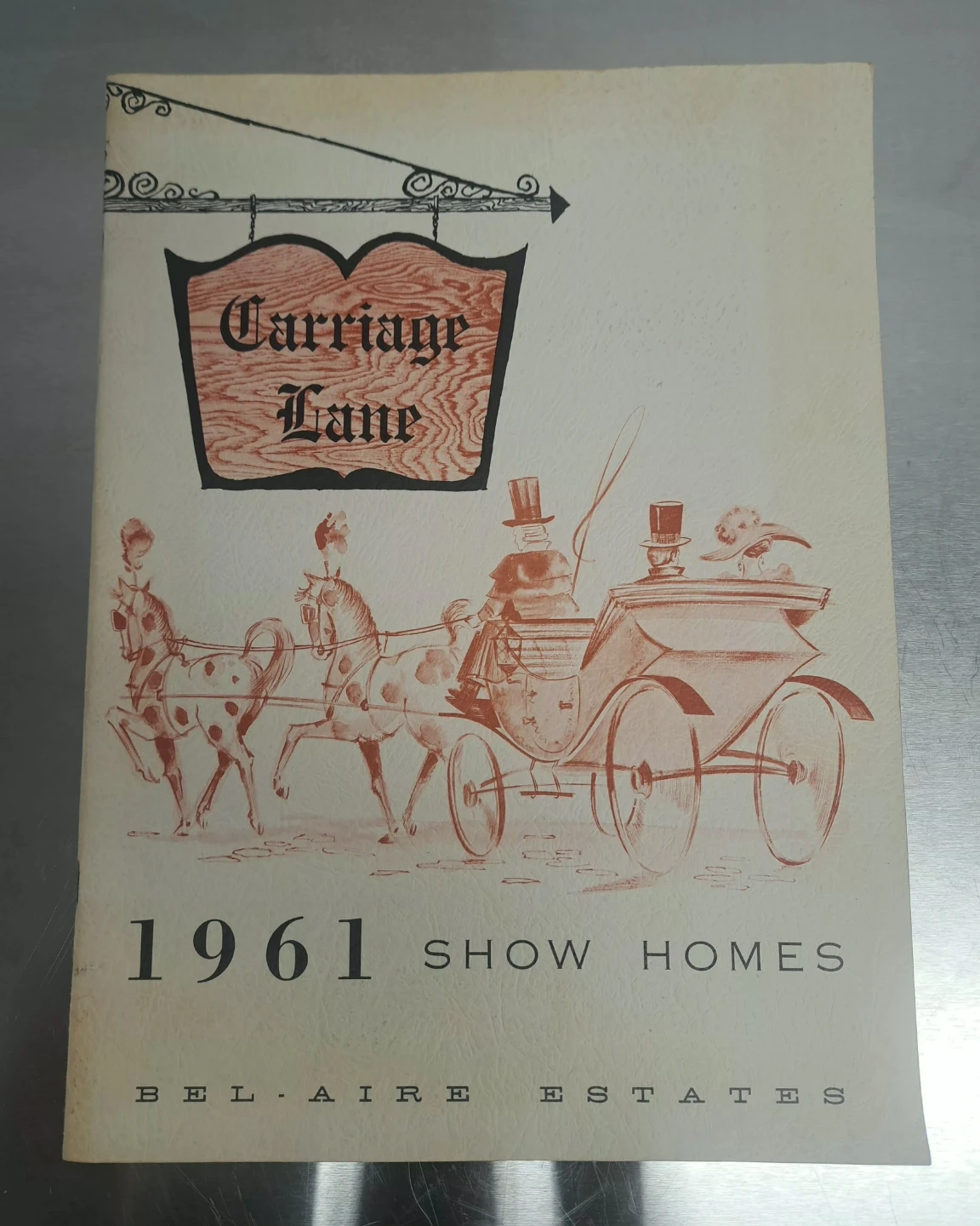 BEL-AIRE ESTATES Calgary 1961 Show Home Catalog multiple builders floor plan layouts depicted with data, including the streets and lots of the depicted show homes! great local historical reference and value to existing dwellings.