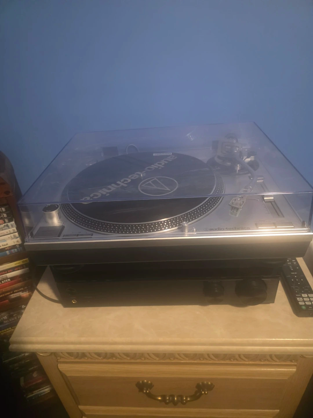 This is an Audio-Technica turntable. It features a dust cover and has a black receiver underneath. It's great for listening to your favourite records!