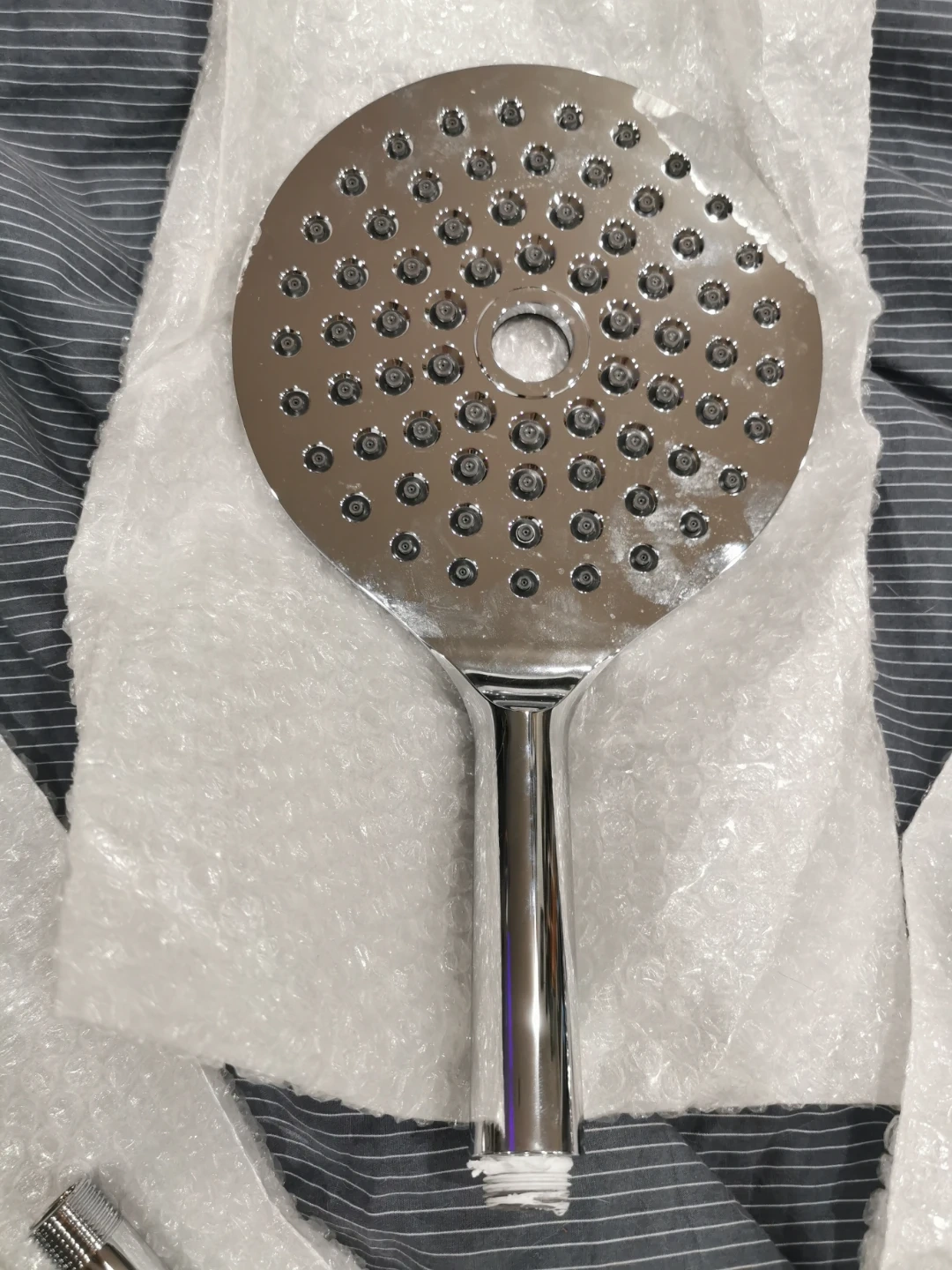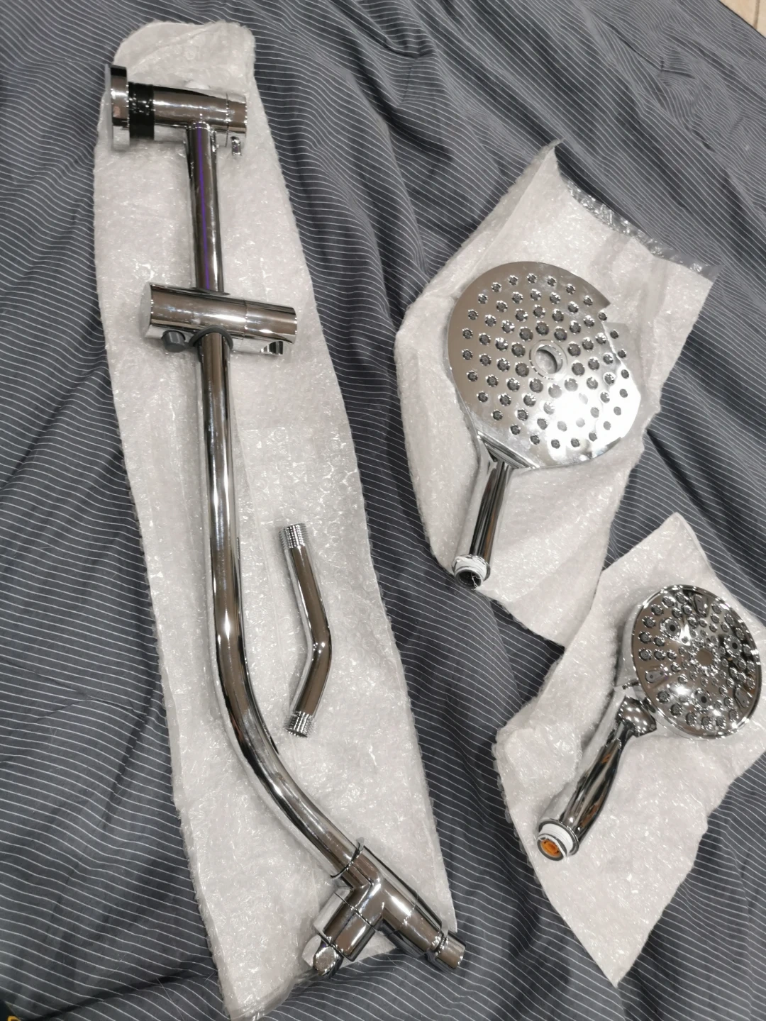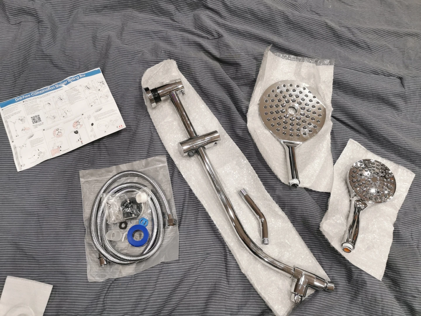 Brand New !! This set includes two shower heads, a flexible hose, and a slide bar for adjustable height. It's made of durable chrome-plated material for a sleek, modern look. The included instructions make setup straightforward!