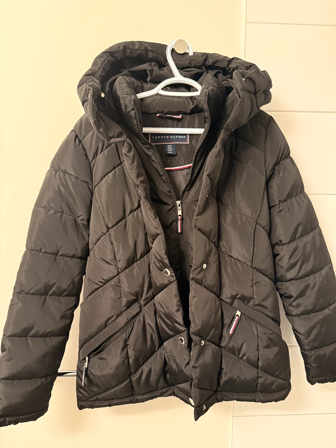 Tommy Hilfiger women puffer jacket with a hood. It's a size S/P. Quilted design and zippered pockets. Perfect for cooler weather!