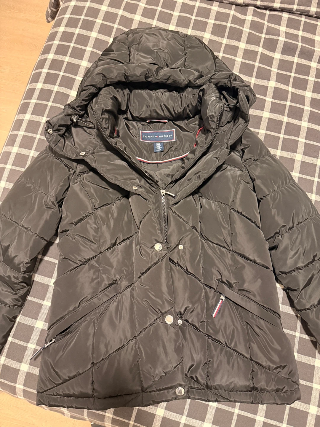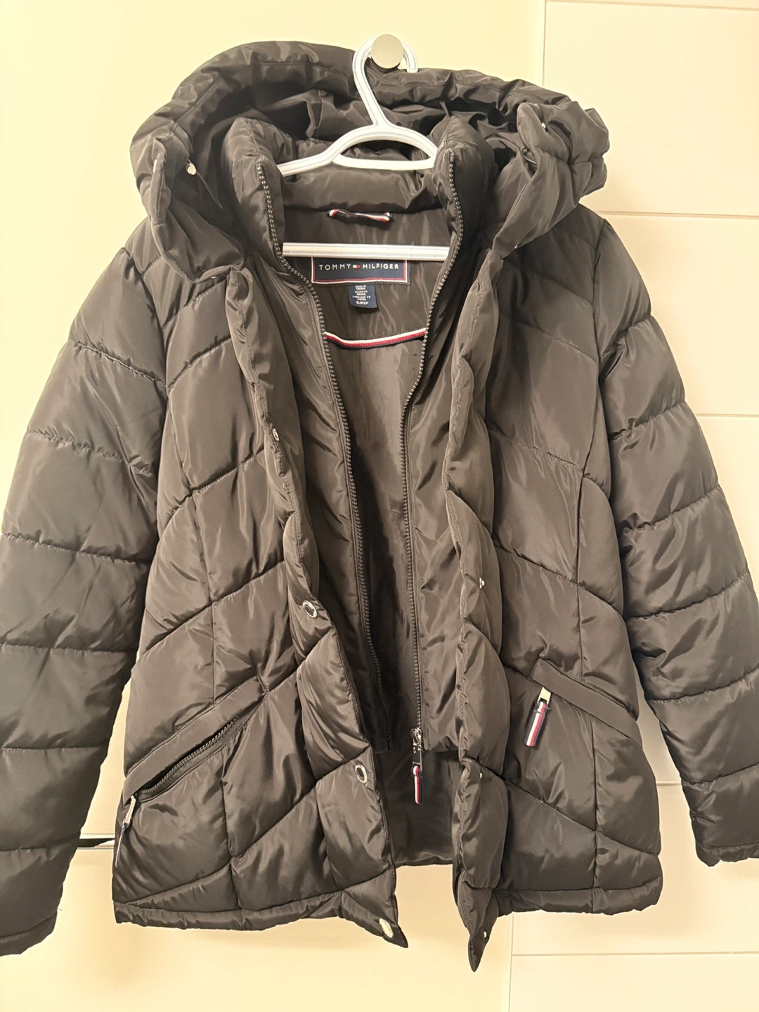 Tommy Hilfiger women puffer jacket with a hood. It's a size S/P. Quilted design and zippered pockets. Perfect for cooler weather!