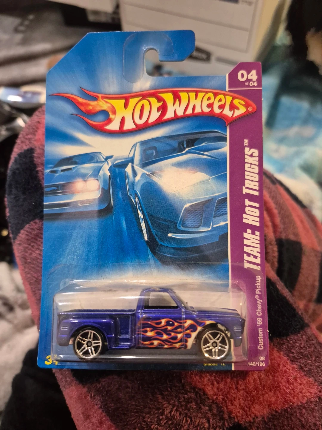 This is a Hot Wheels Custom '69 Chevy Pickup truck. It's part of the Team: Hot Trucks series and is item 140/196. The truck is blue with flame graphics.