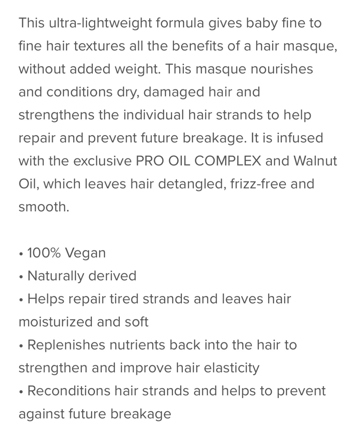 Lightweight deep repair mask specially made for baby fine to fine hair textures. Hydrates, nourishes, and strengthens without weighing hair down — leaves hair soft, smooth, detangled, and frizz-free.