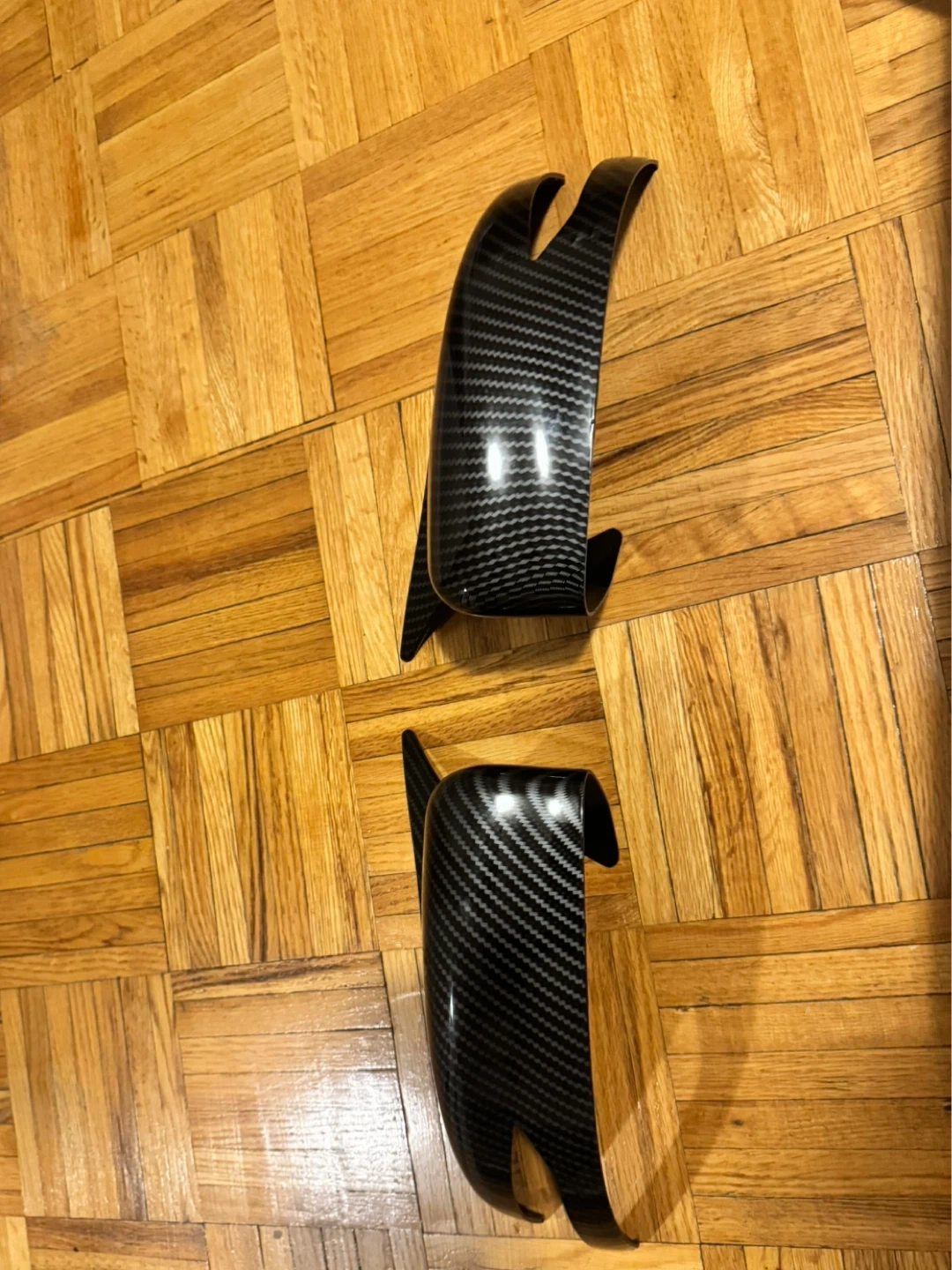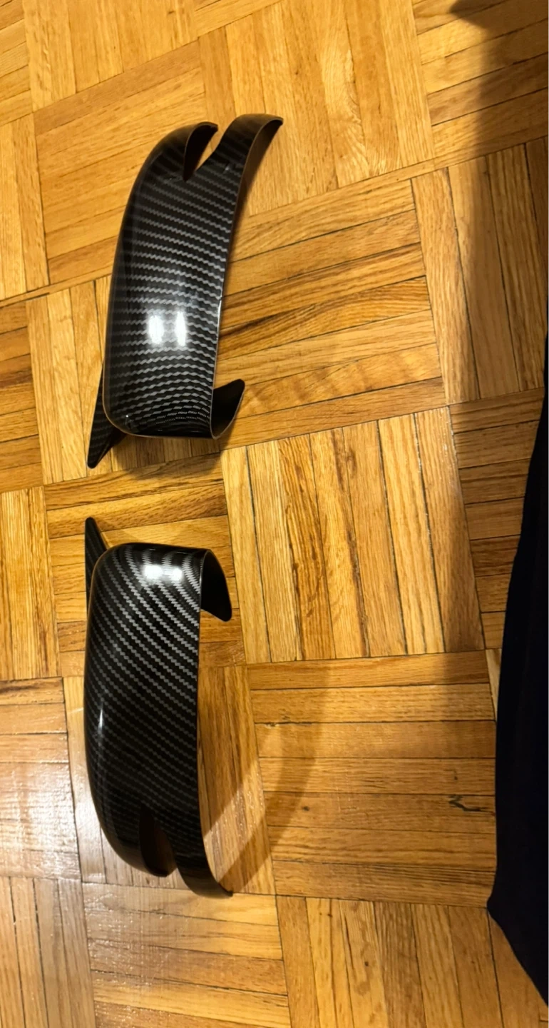 A pair of carbon fiber mirror covers. These are designed for a specific vehicle model, but that info isn't visible. They have pre-applied double-sided tape on the back for installation. These would be used to enhance the look of a car's side mirrors.