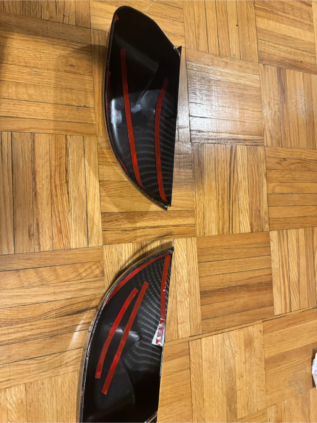 A pair of carbon fiber mirror covers. These are designed for a specific vehicle model, but that info isn't visible. They have pre-applied double-sided tape on the back for installation. These would be used to enhance the look of a car's side mirrors.