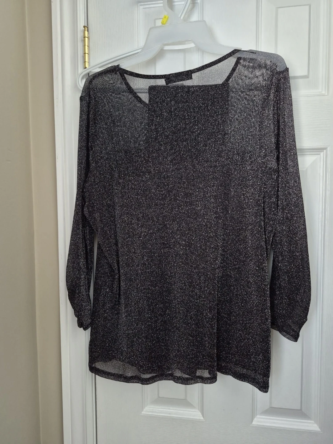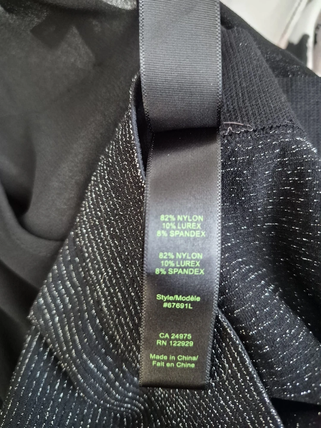 Reitman's sparkly sheer knit top - 100% Polyester. Has a boat neckline and long sleeves. The pants are full length. It's made from a blend of nylon, Lurex, and spandex.