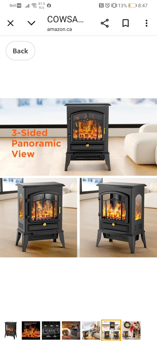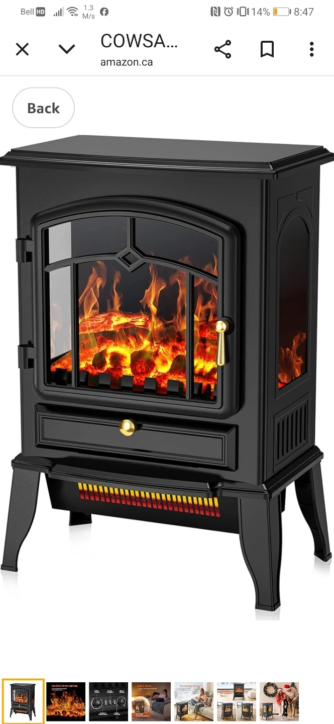 This electric fireplace heater provides a cozy ambiance with a realistic flame effect. It's a freestanding unit with a black finish and includes a drawer for storage. No venting is required.