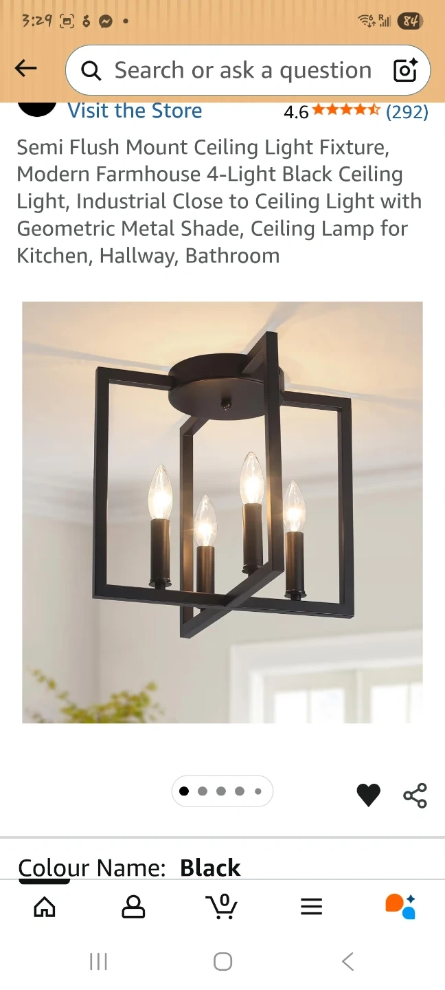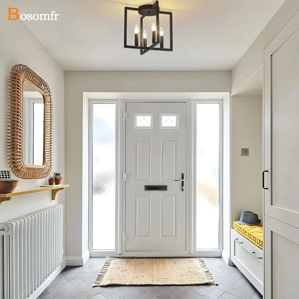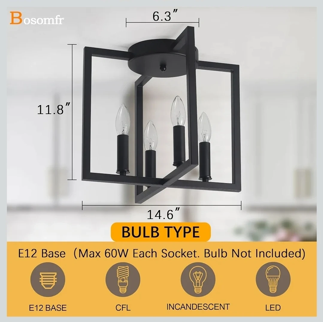 This is a black, geometric semi flush mount ceiling light fixture with four candle-style sockets. It's made of high-quality metal and features an E12 ceramic lamp holder. Bulbs are not included and use an E12 base, max 60W each socket. This fixture would be great for a kitchen, hallway, or bathroom.