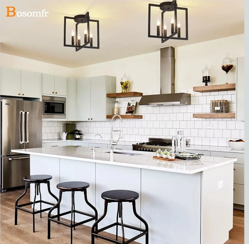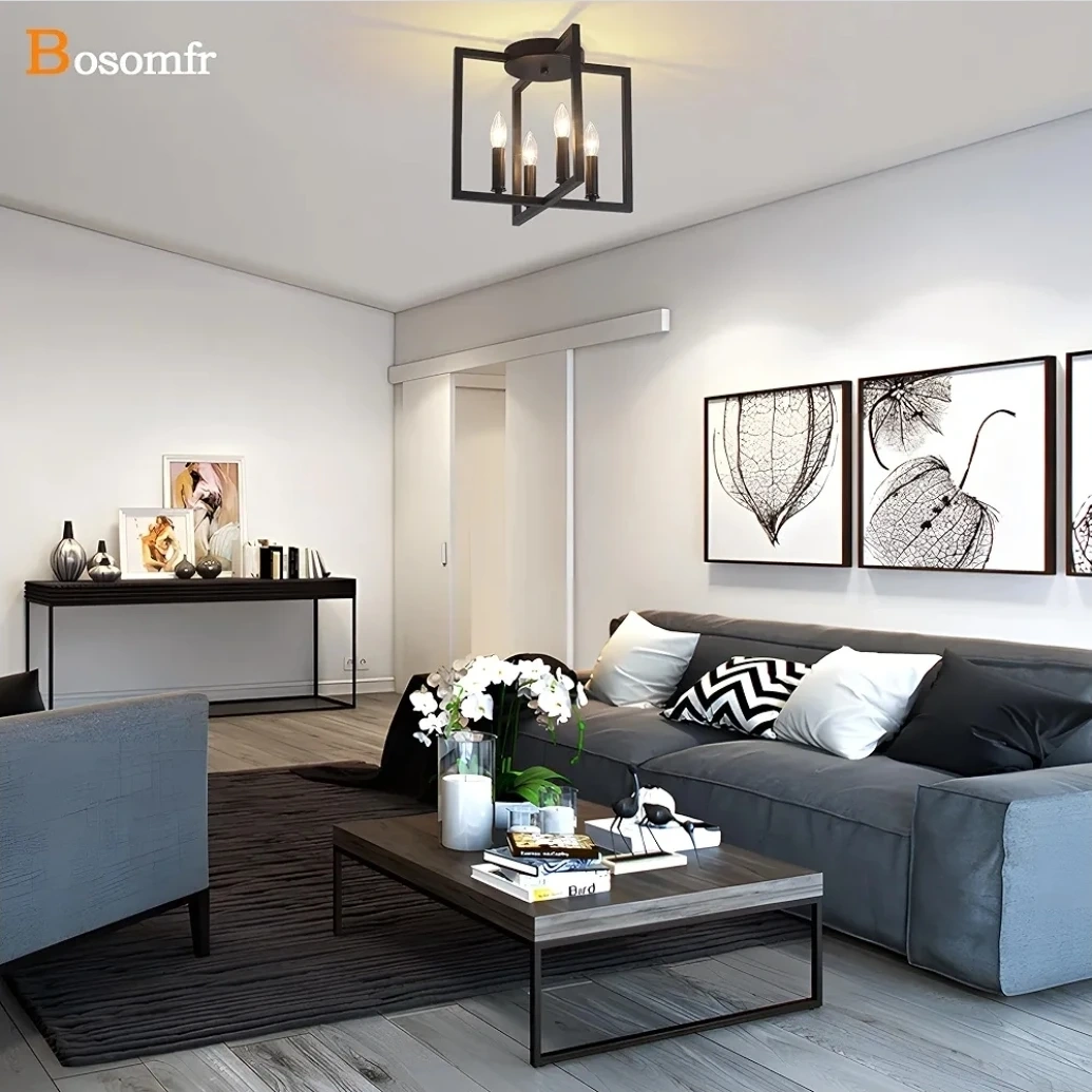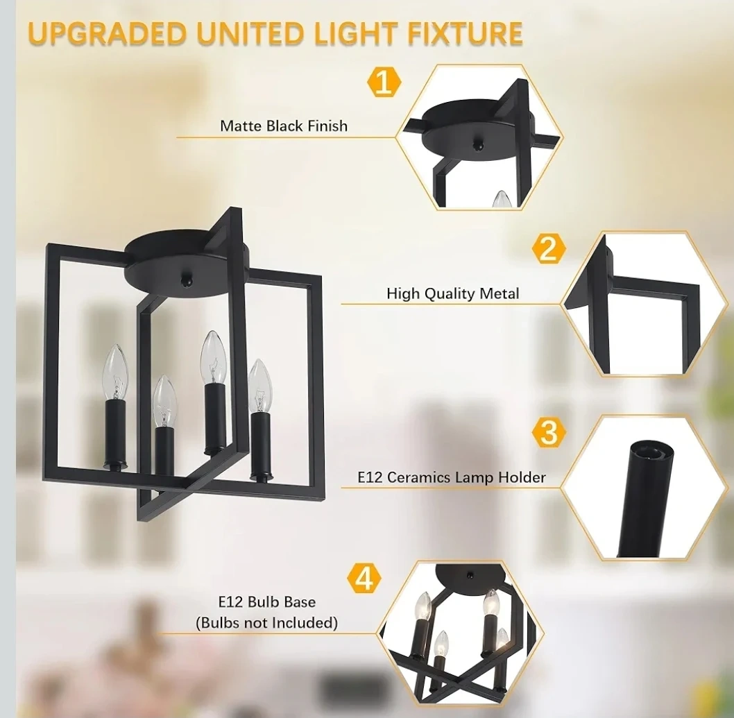 This is a black, geometric semi flush mount ceiling light fixture with four candle-style sockets. It's made of high-quality metal and features an E12 ceramic lamp holder. Bulbs are not included and use an E12 base, max 60W each socket. This fixture would be great for a kitchen, hallway, or bathroom.