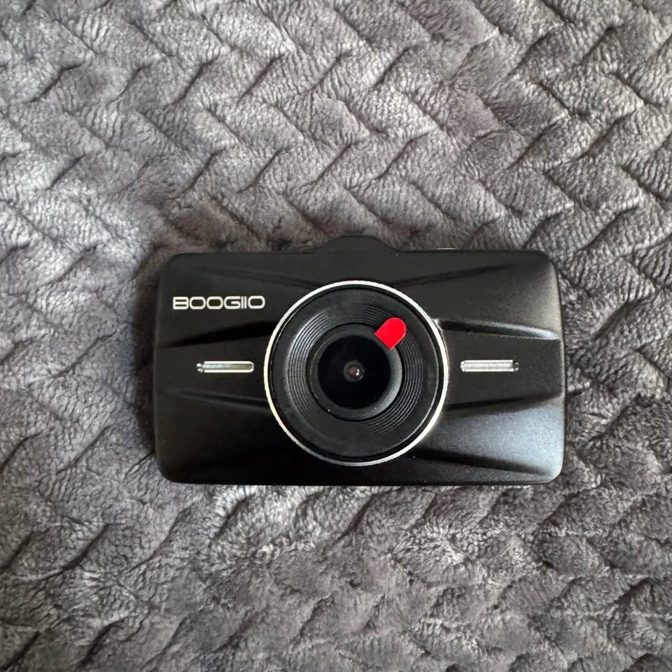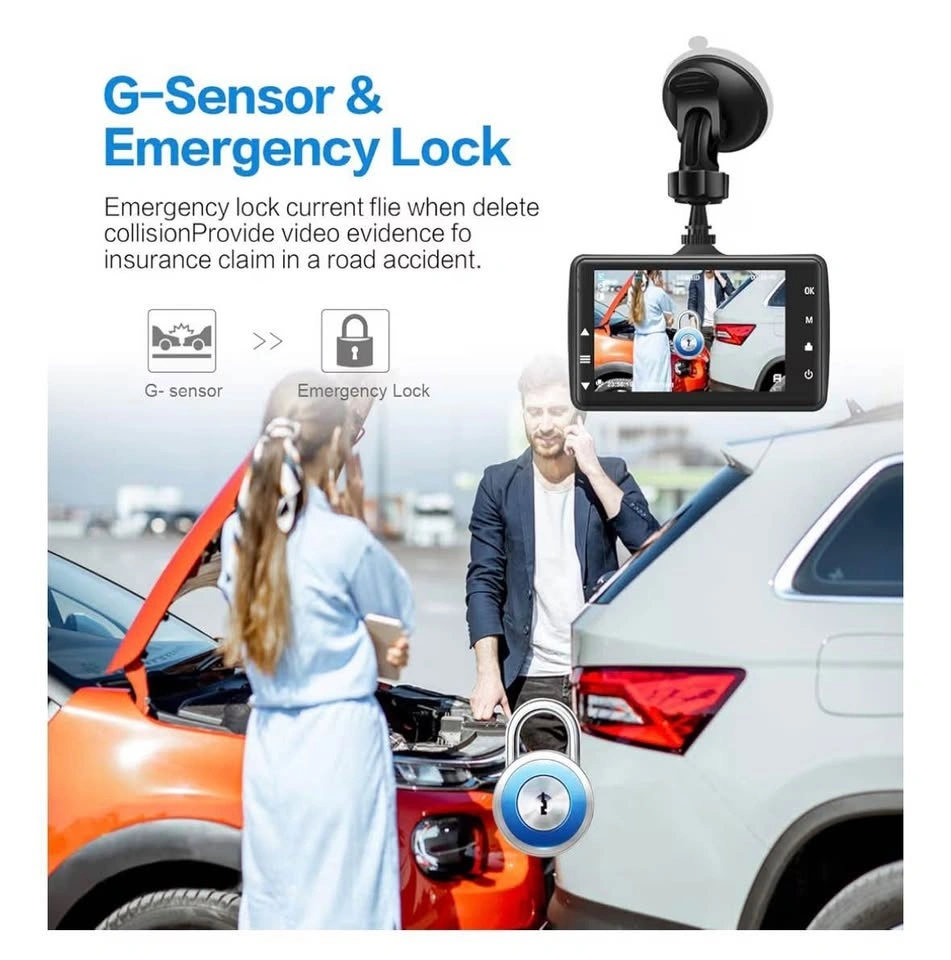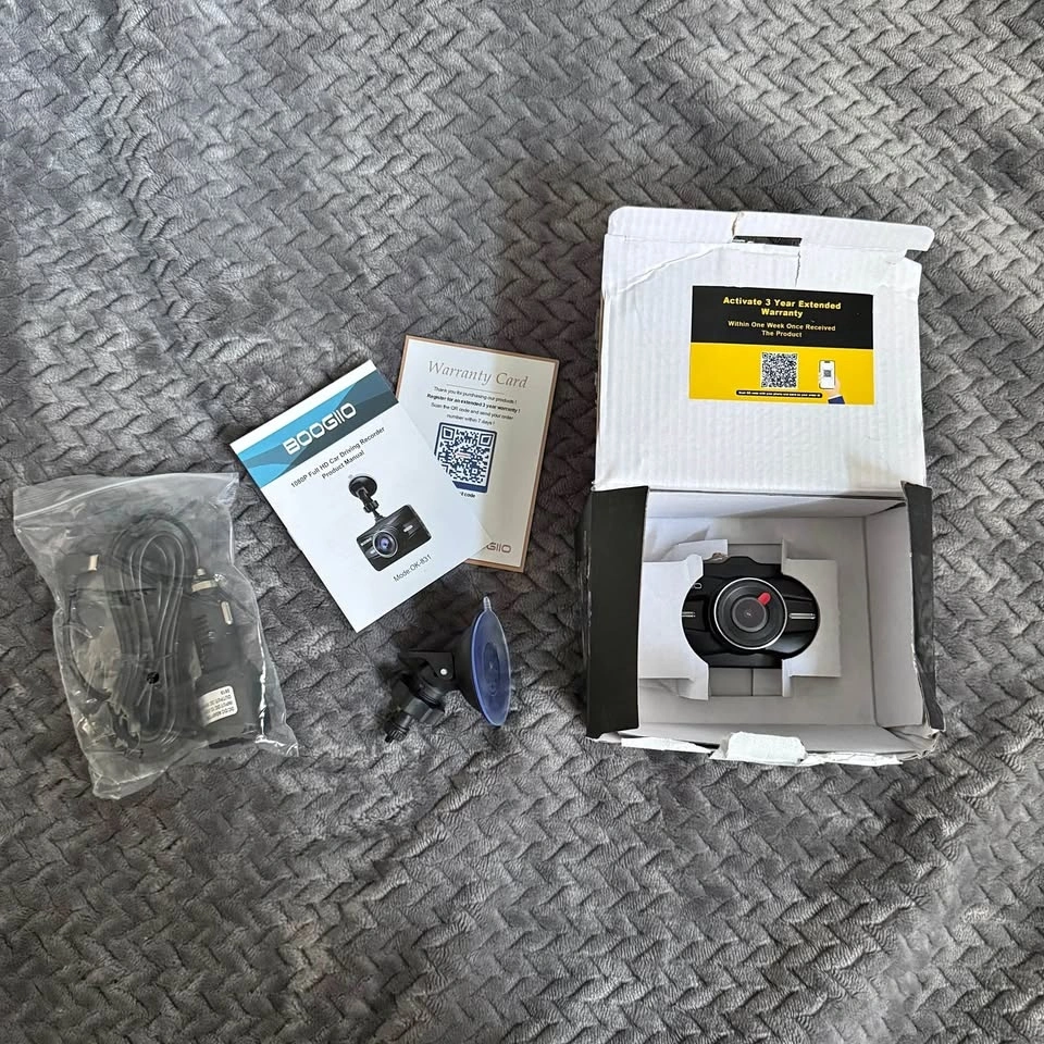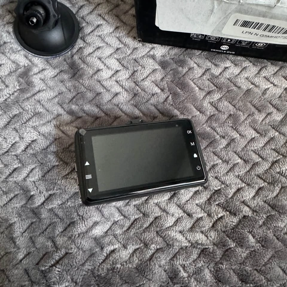New, open box dash cam. Features a 3'' IPS screen, 170° wide angle, and aluminum alloy case. Includes WDR, G-Sensor, parking monitor, loop recording, and motion detection.