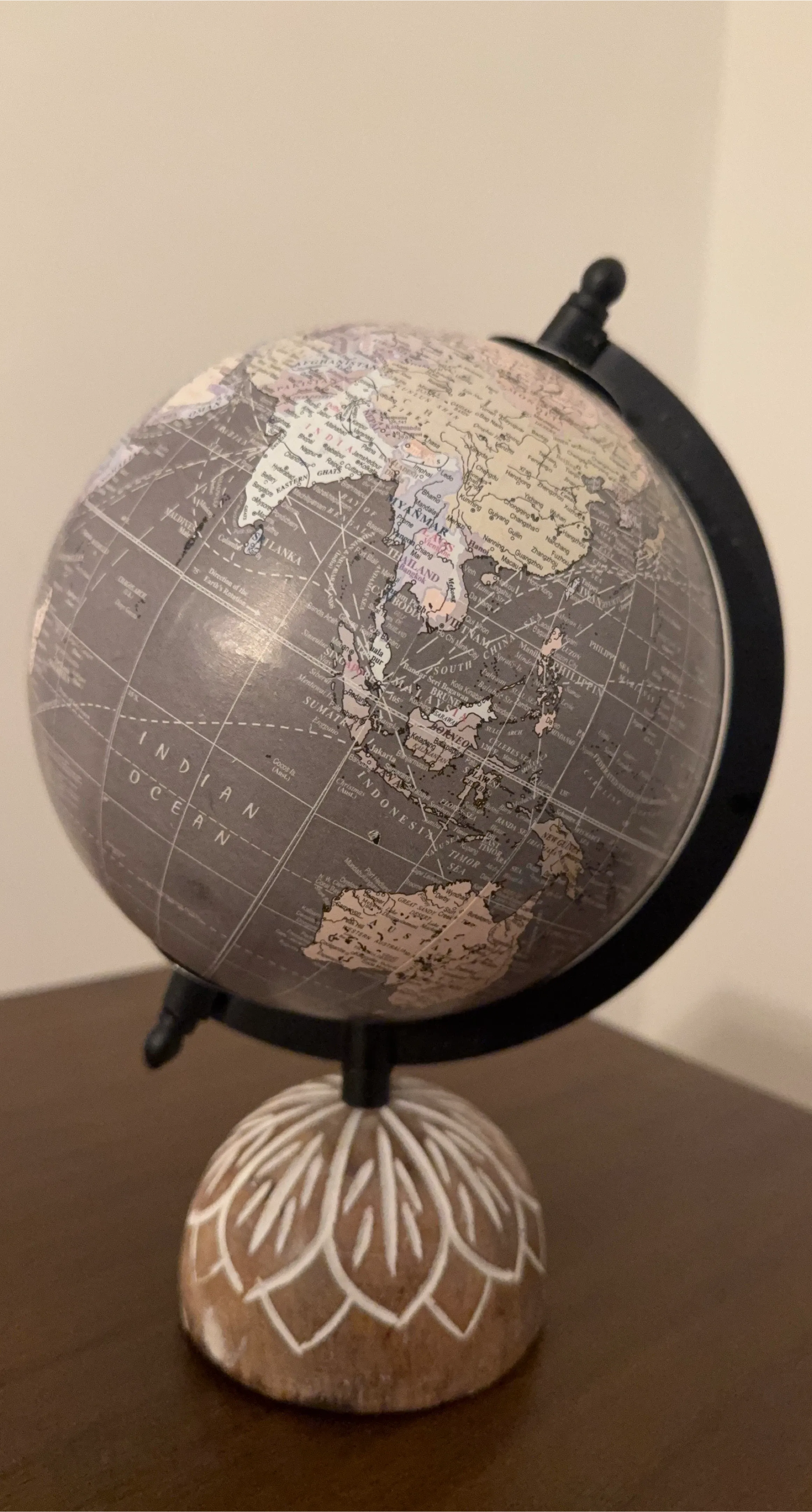 This decorative globe features a gray map with a detailed floral-inspired base. It displays continents, countries, oceans, and cities. It's a great piece for any desk or shelf! (Candles and coffee table sold separately)