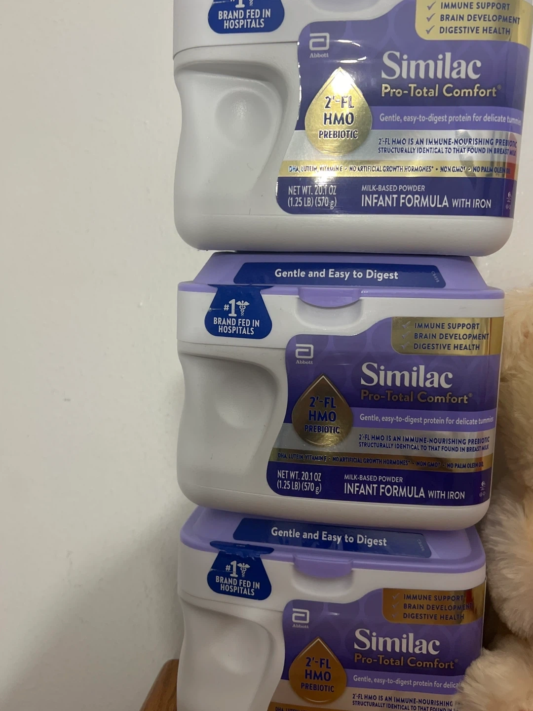 This milk-based powder infant formula is made by Similac Pro-Total Comfort. It contains 2'-FL HMO prebiotic for immune support, brain development, and digestive health. Each container has a net weight of 20.1 oz (570g). It's gentle and easy to digest for delicate tummies. This formula is also non-GMO and has no artificial growth hormones.