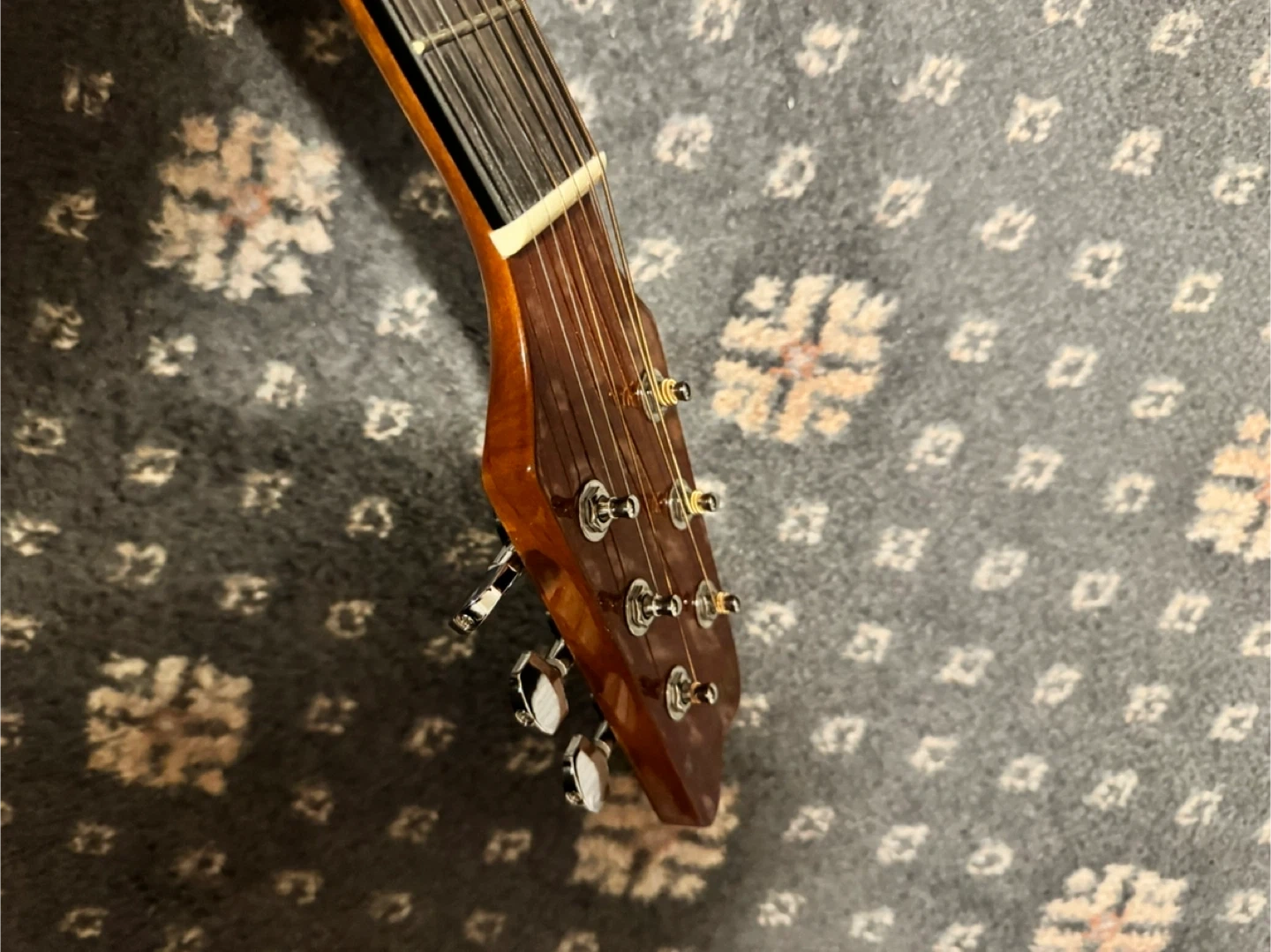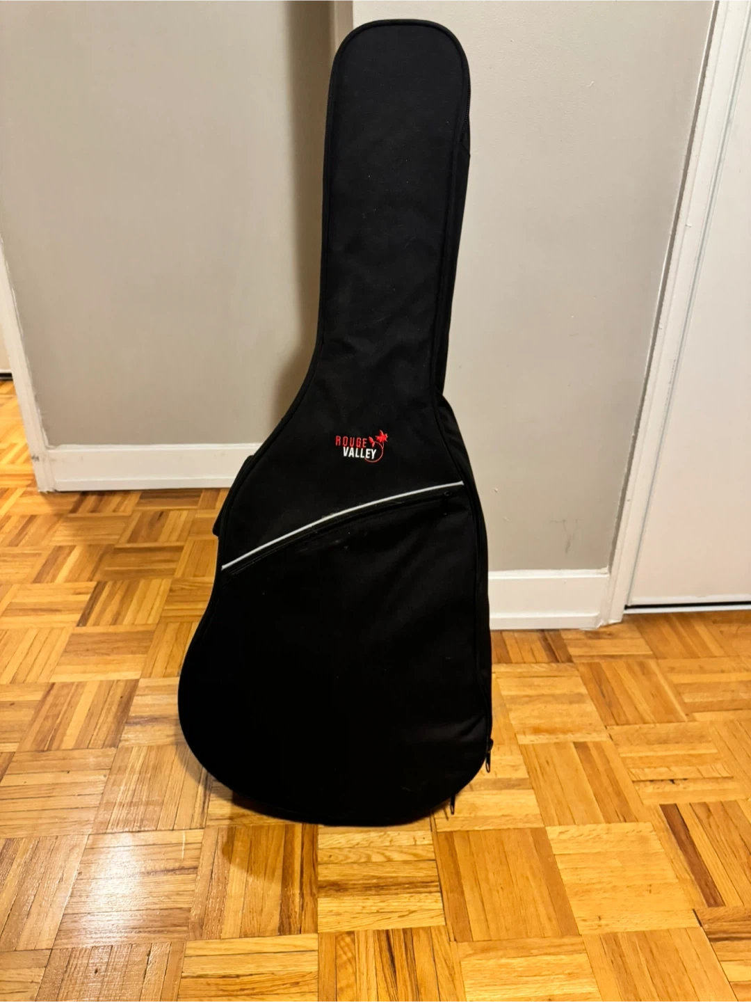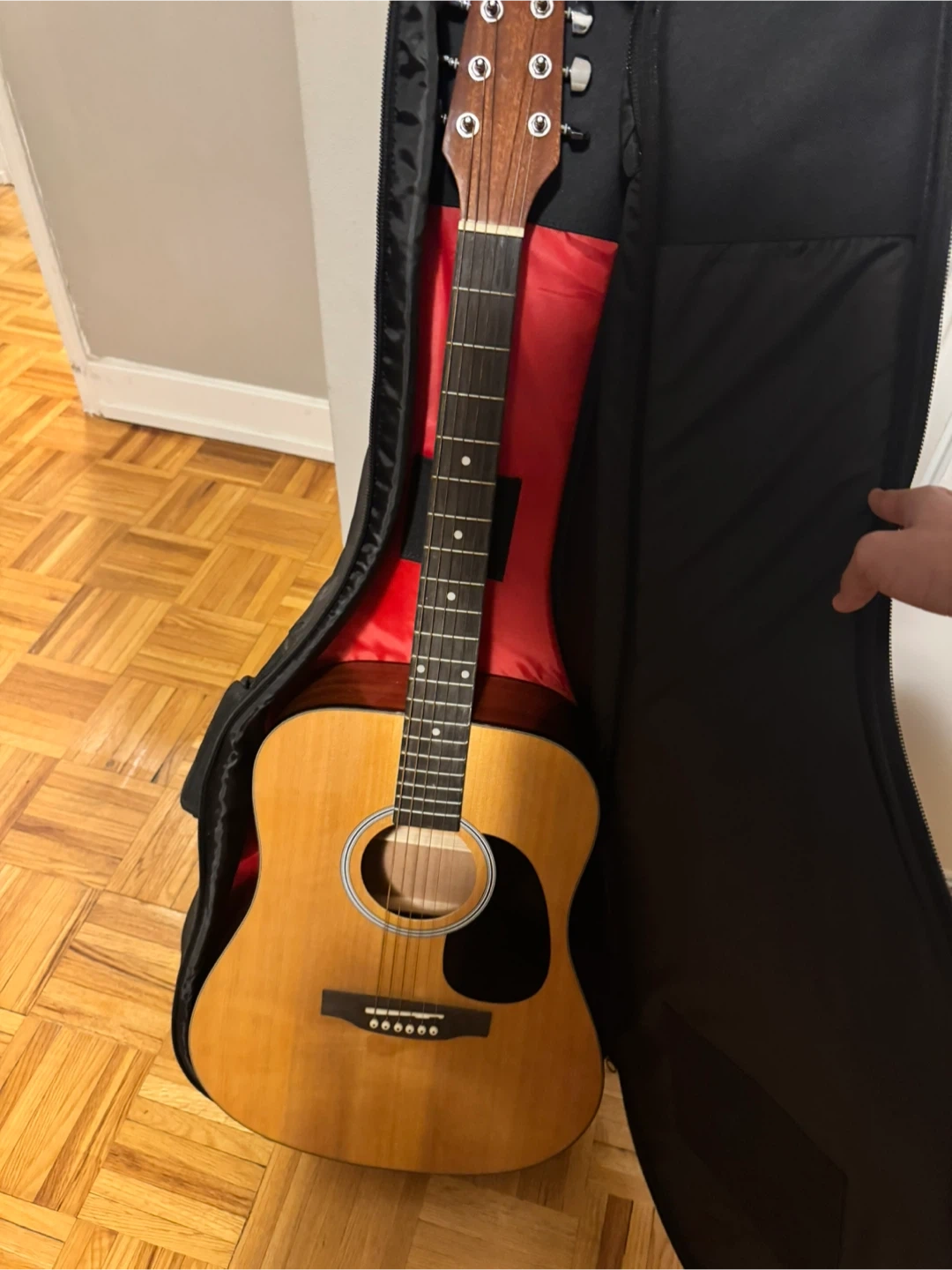Acoustic guitar with a natural wood finish. It's in good condition and comes with a black gig bag. This guitar is great for beginners learning to play!