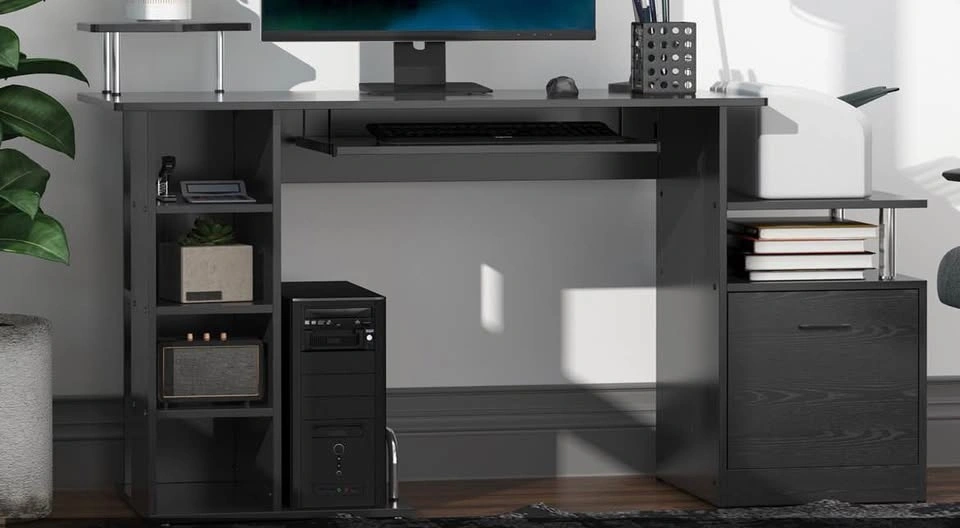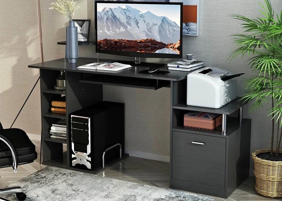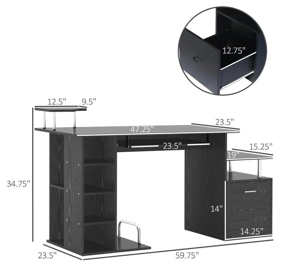 Wood computer desk table with a storage shelf and drawer. Great for a home office. Black, brand new and already assembled.