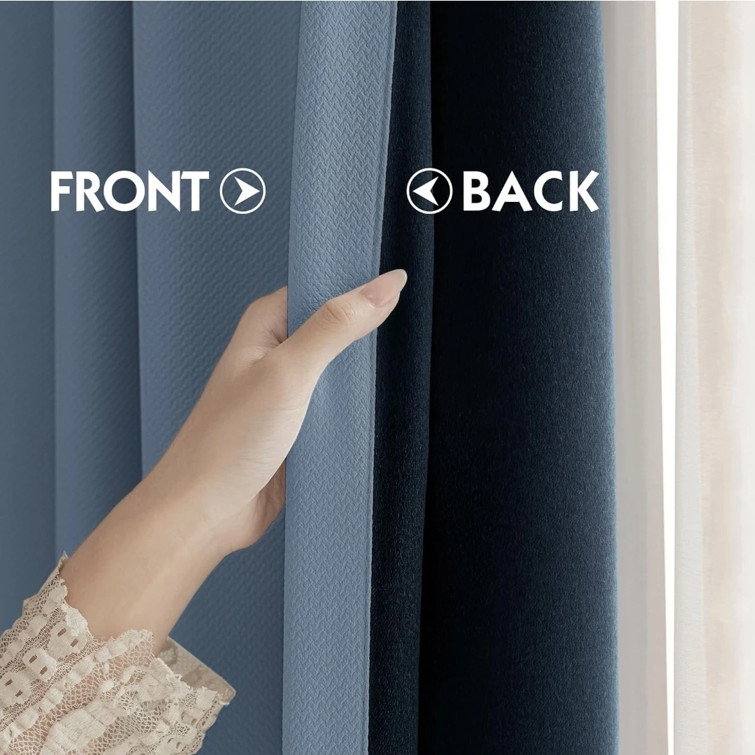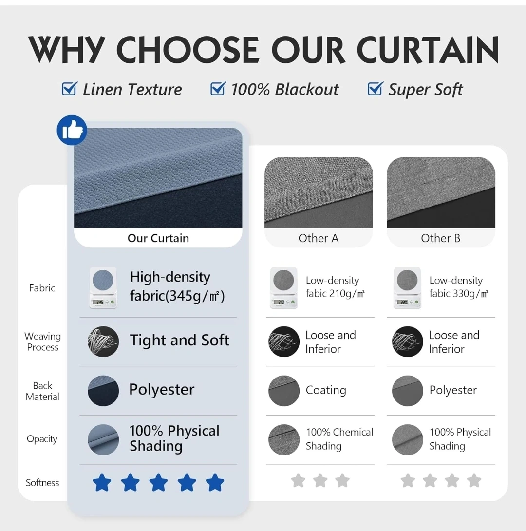 These FMFUNCTEX curtains offer 100% blackout with a linen texture. They're made from high-density polyester fabric for thermal insulation and noise reduction. The slate blue colour adds a nice touch to any room.